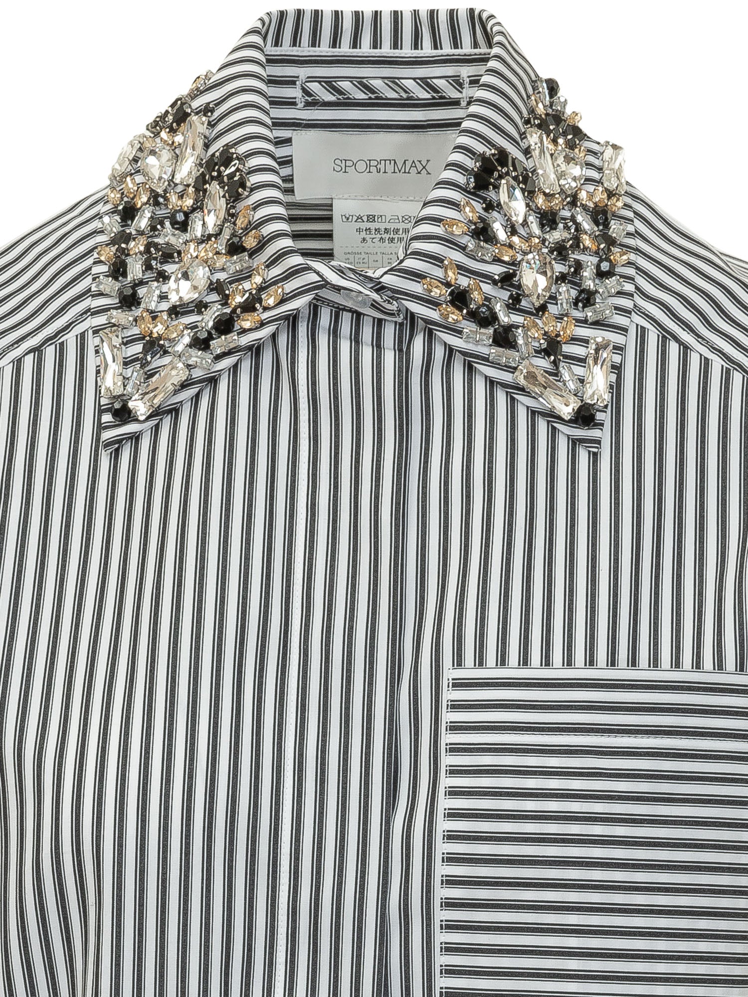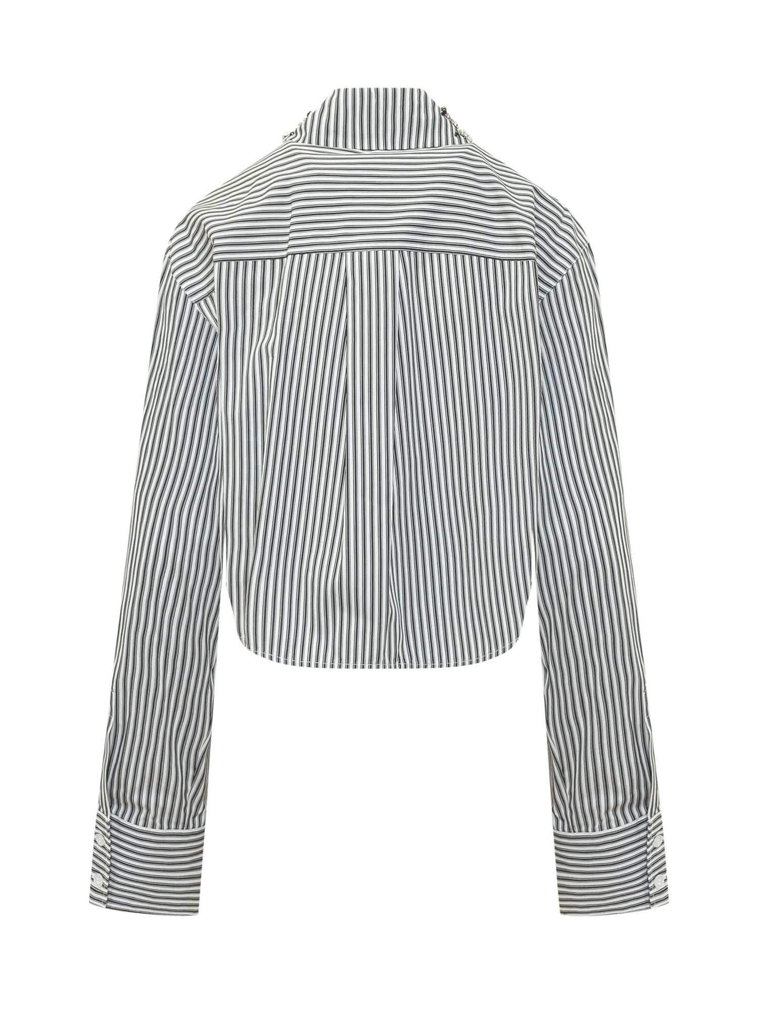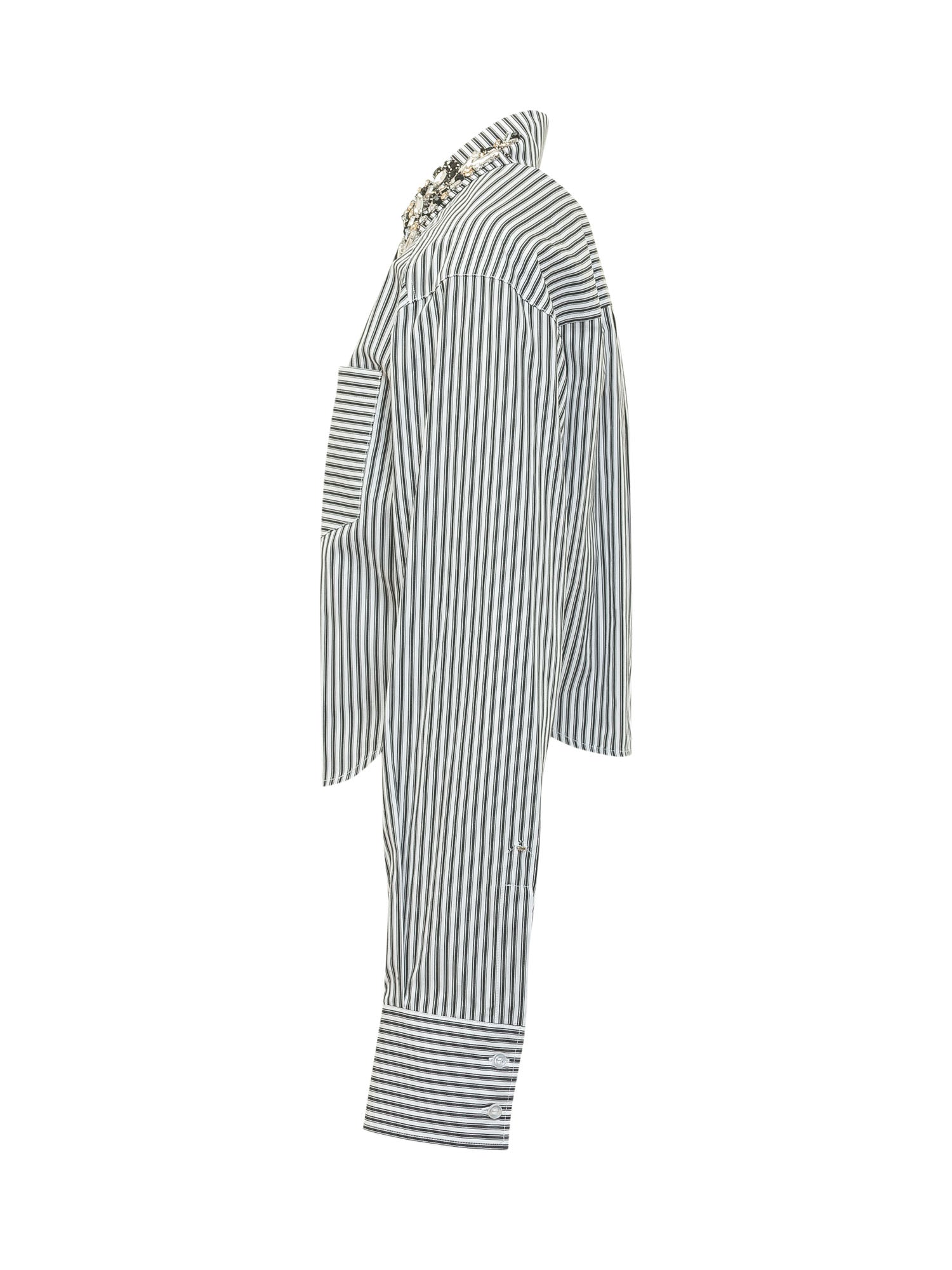 Camicia a righe verticali con colletto classico arricchito da applicazioni gioiello. Maniche lunghe con polsini ampi e tasca applicata sul petto. Linea dritta dal design ricercato ideale per look distintivi.