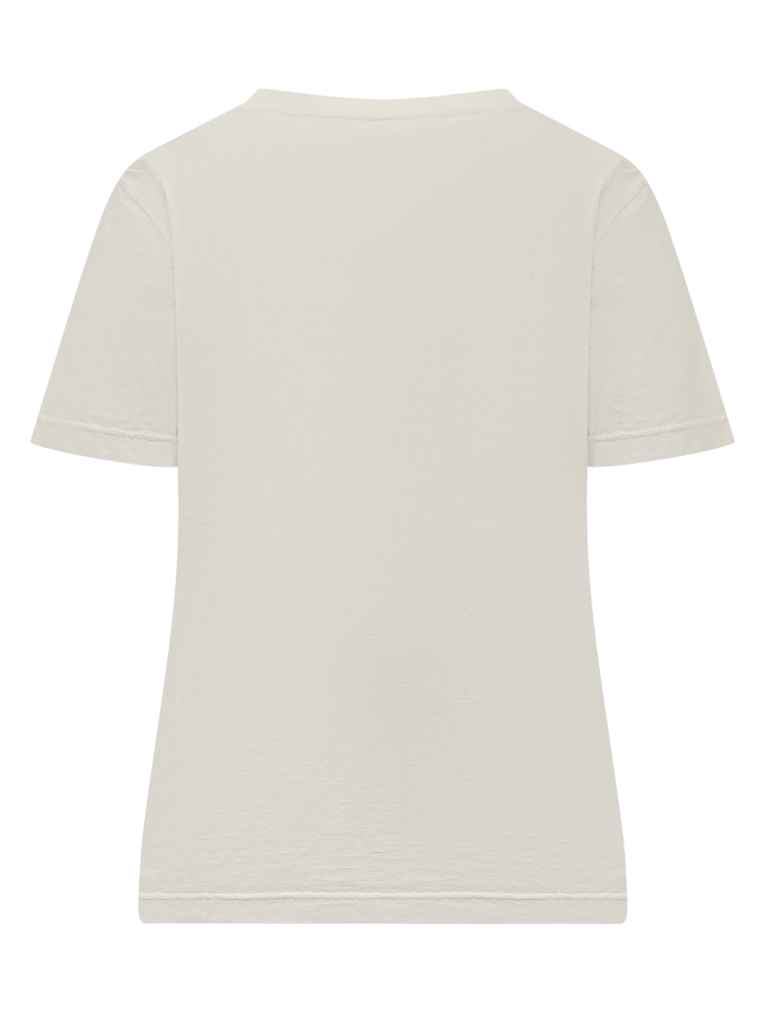 T-shirt slim con maniche corte e girocollo. Piccola stampa floreale con lettering sul petto. Linea aderente e design pulito.