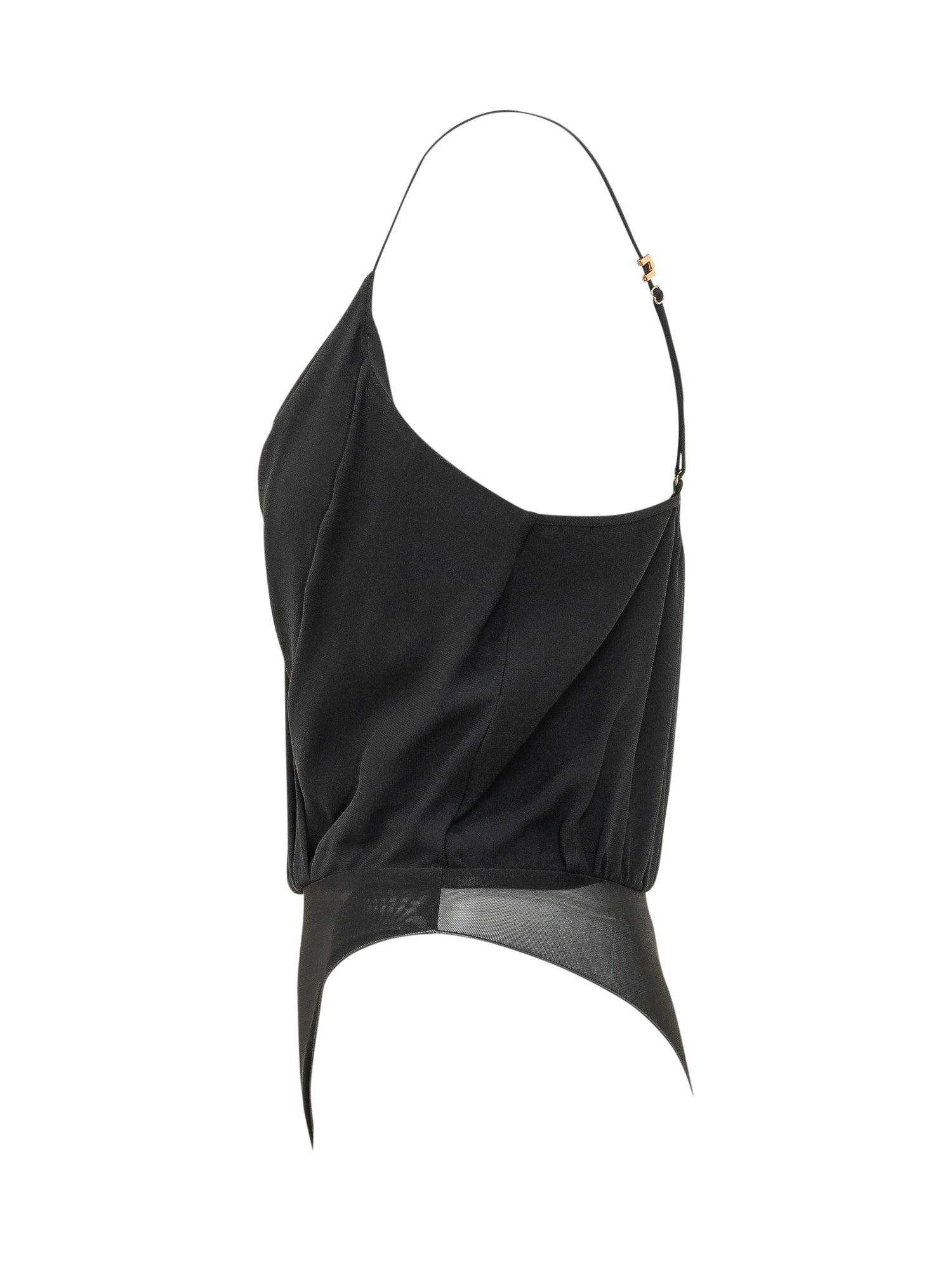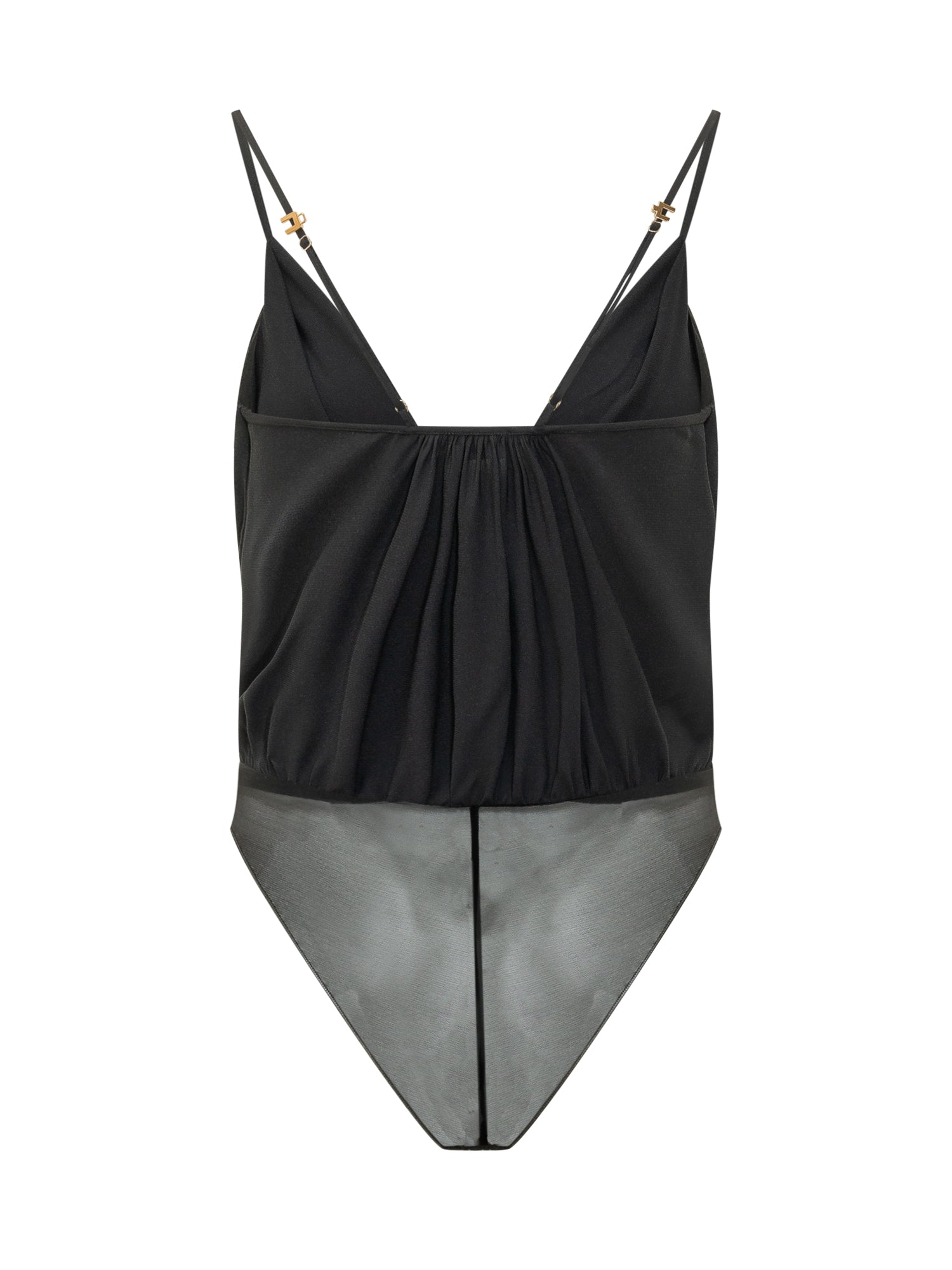 Body con scollo incrociato drappeggiato, spalline sottili regolabili e parte inferiore in mesh semitrasparente. Silhouette chic e moderna.