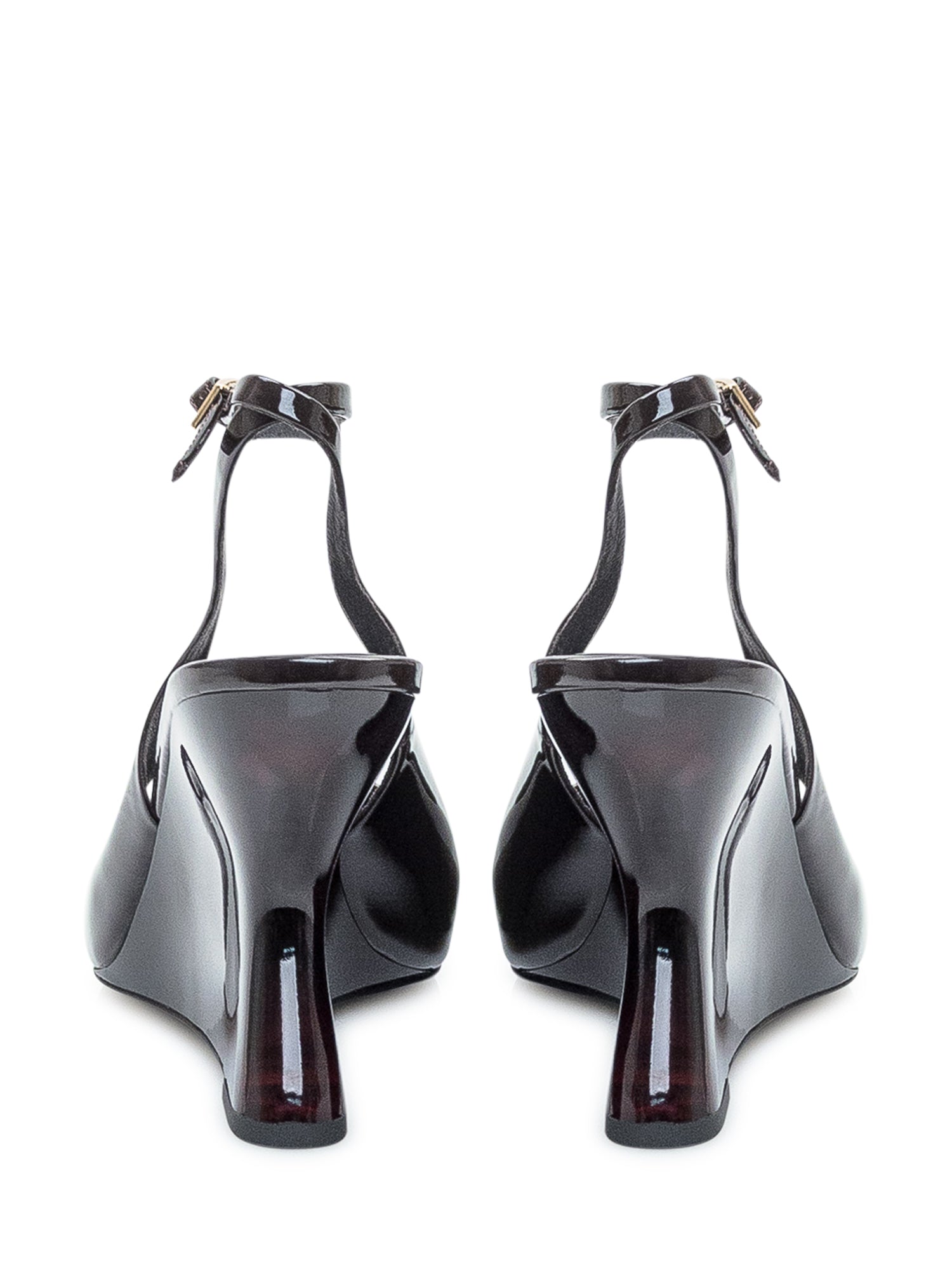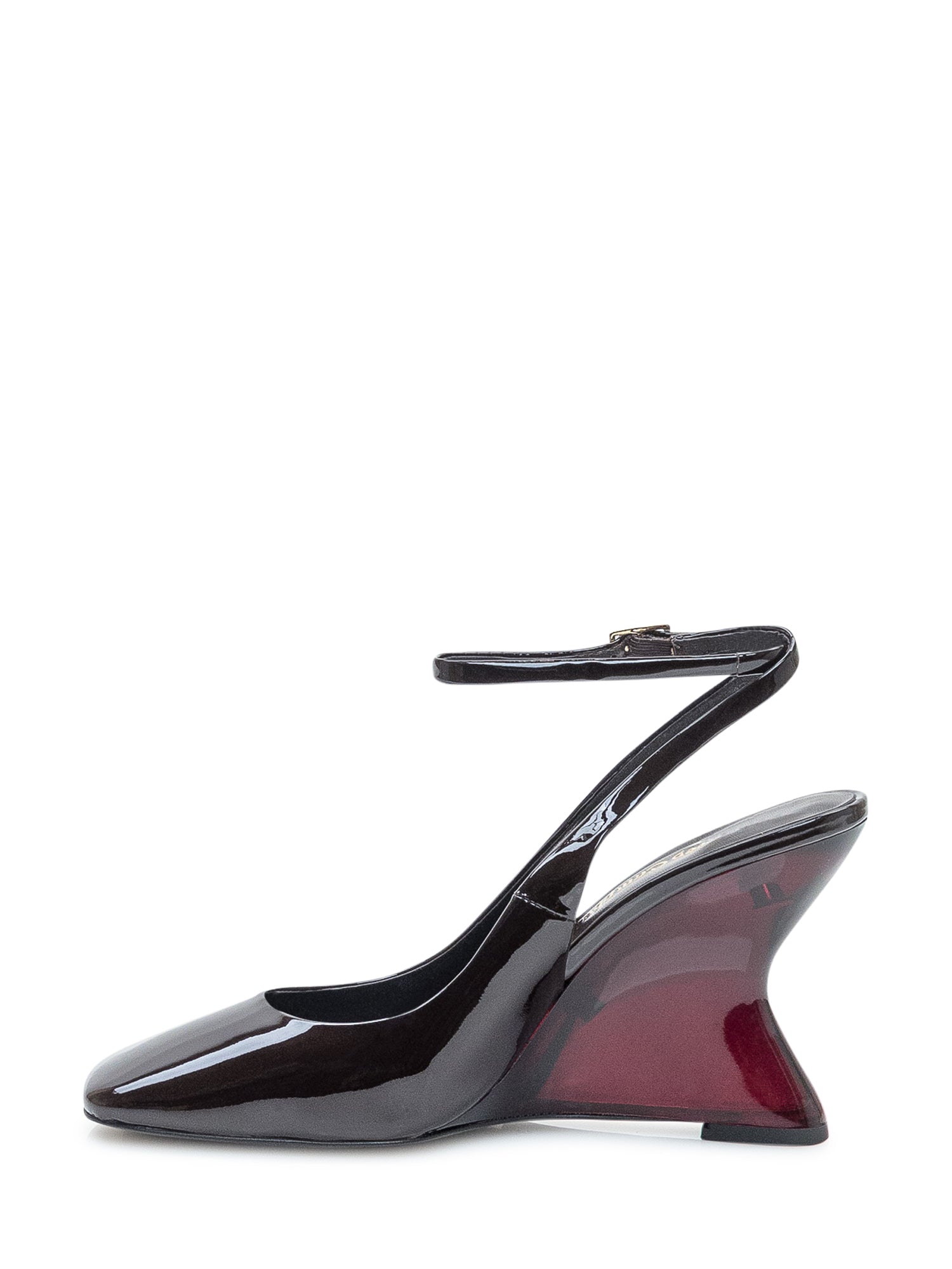 Décolleté Jeffrey Campbell in vernice nera con cinturino alla caviglia e zeppa scultorea bicolor rosso e nero.