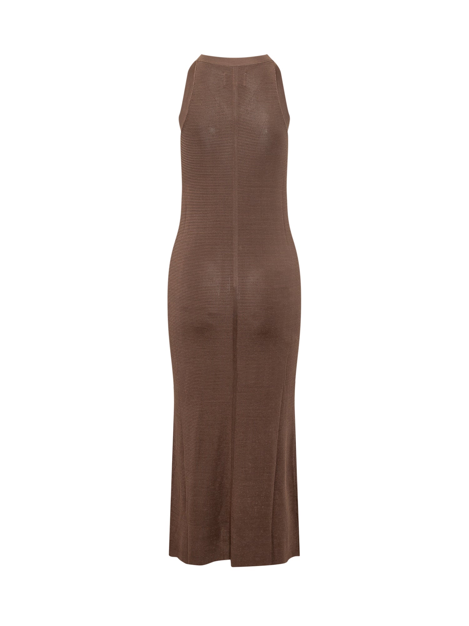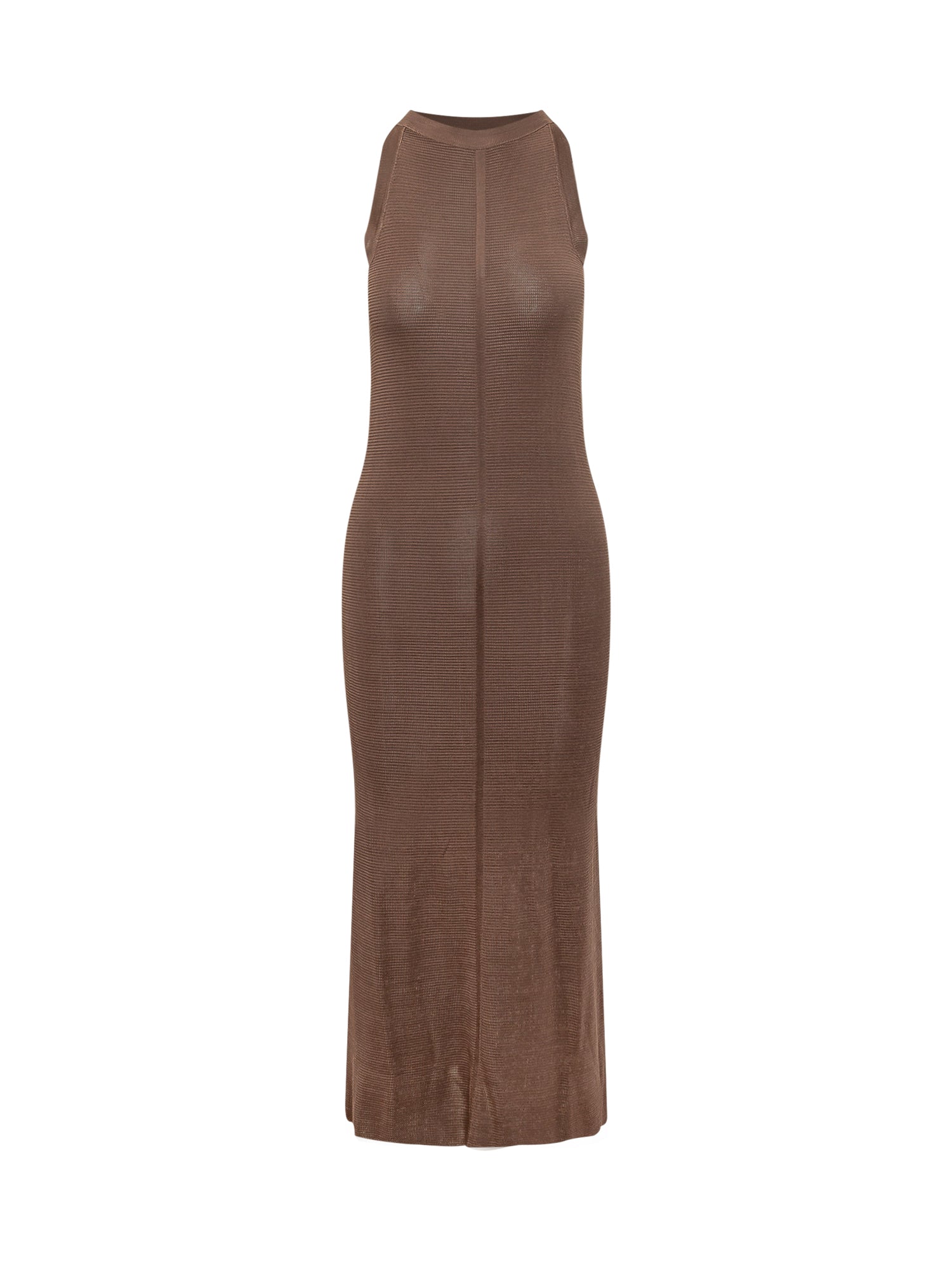 Abito maxi in maglia dalla linea aderente con vestibilità slanciata. Girocollo pulito, spalle scoperte e lavorazione a coste sottili che valorizza la silhouette. Fondo lungo con caduta fluida.