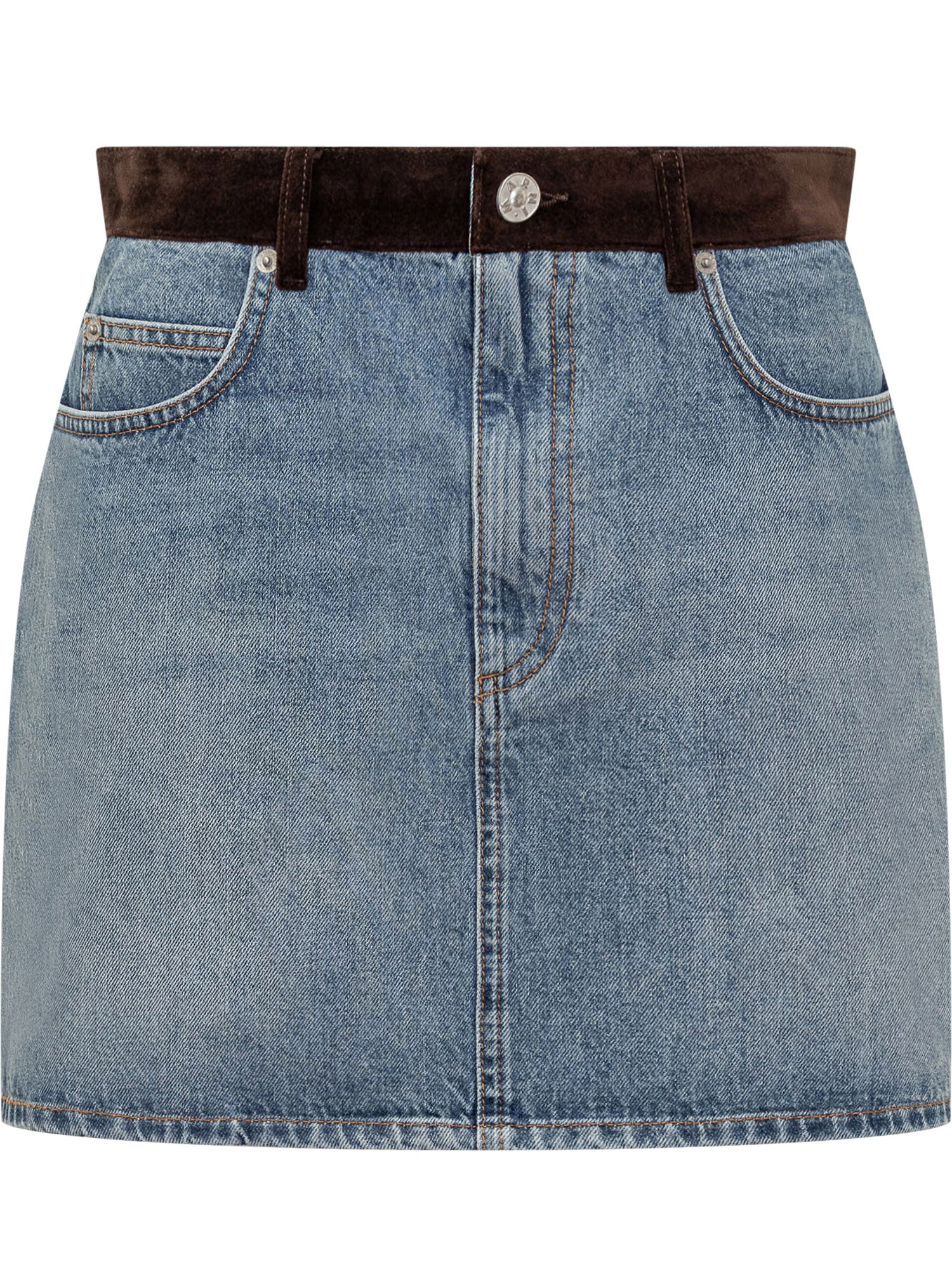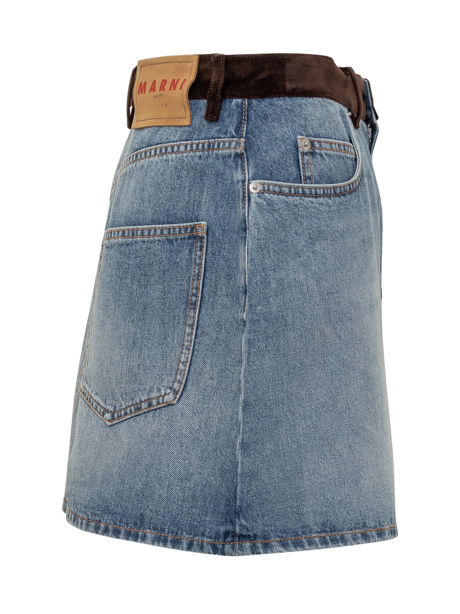 Gonna Marni in denim blu con cintura in suede marrone e tasche posteriori a contrasto. Design corto e silhouette dritta per uno stile casual contemporaneo. Logo in pelle sul retro.