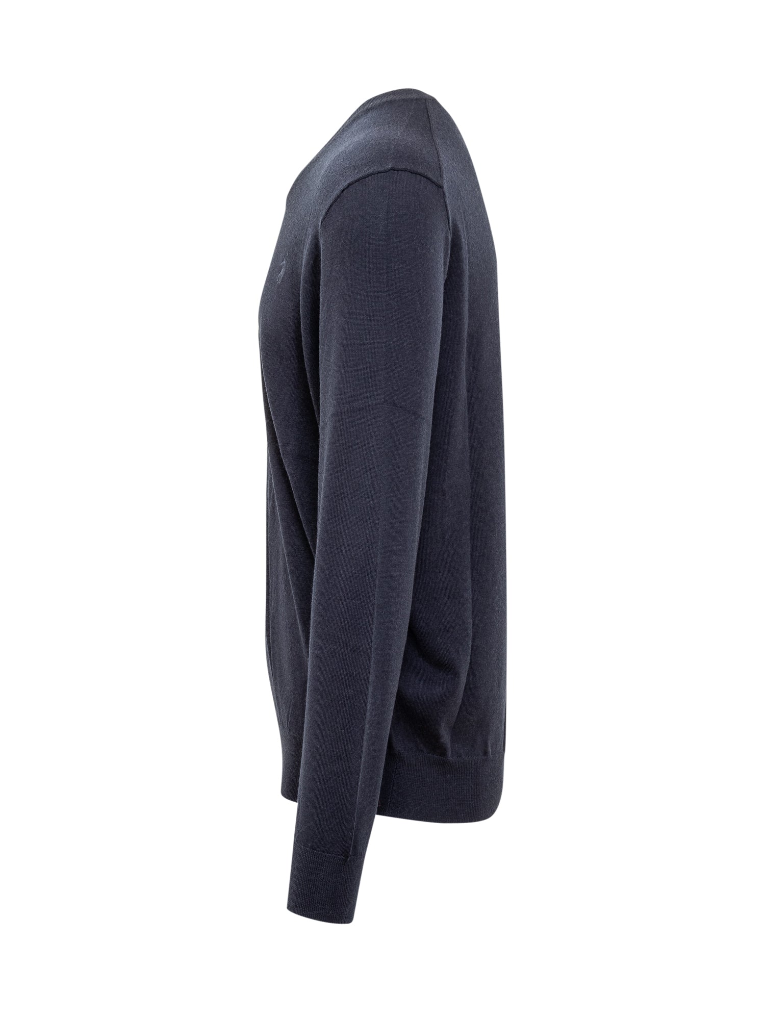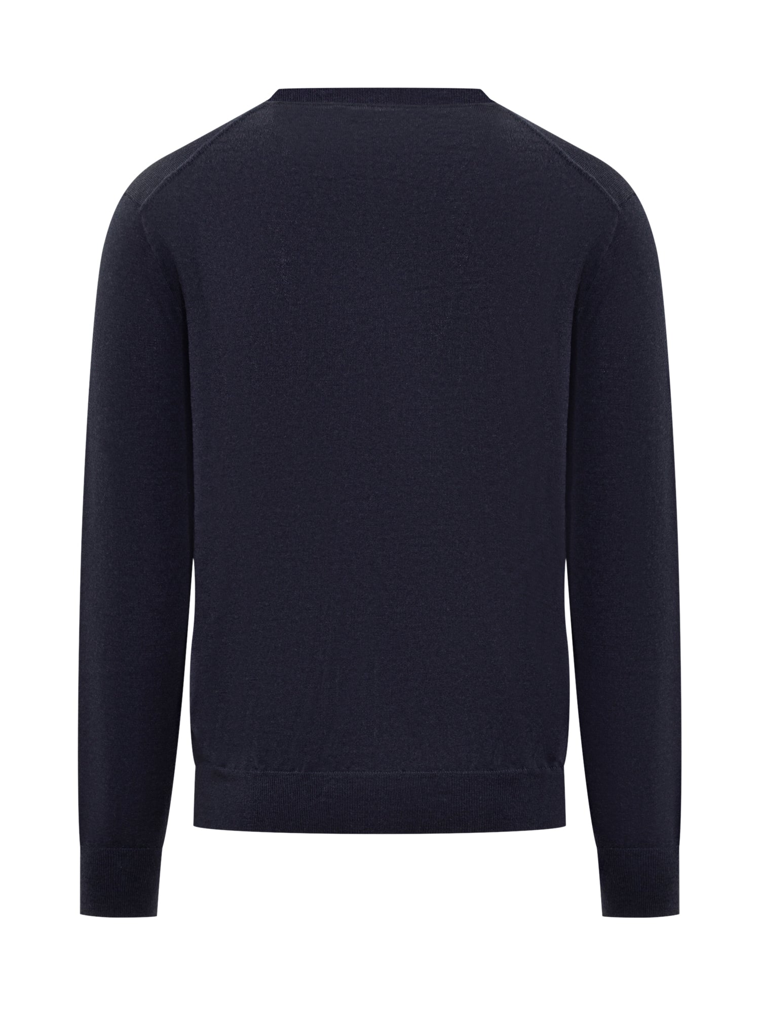 Maglione Polo Ralph Lauren in lana vergine blu scuro con scollo a V e logo pony ricamato sul petto.