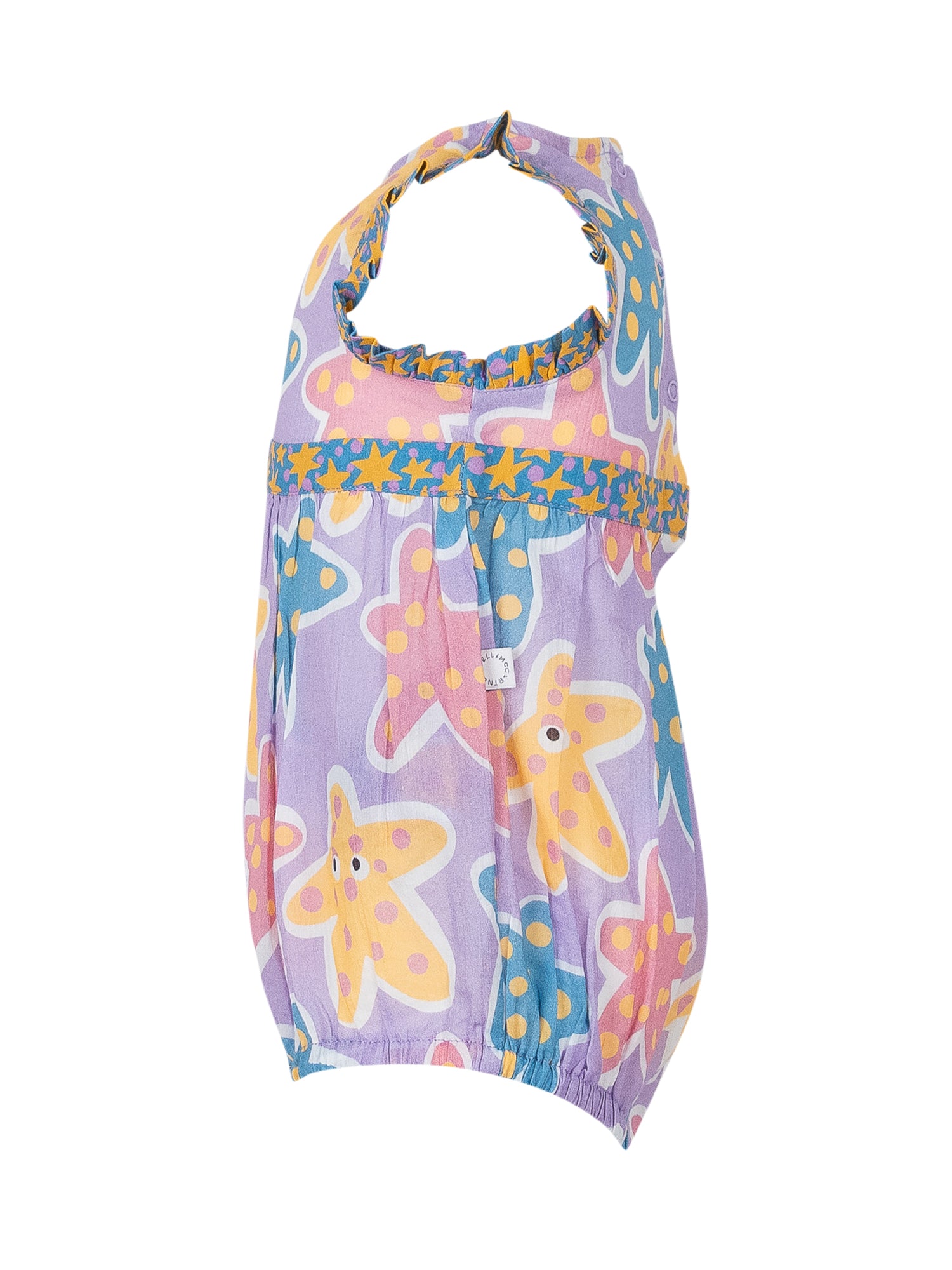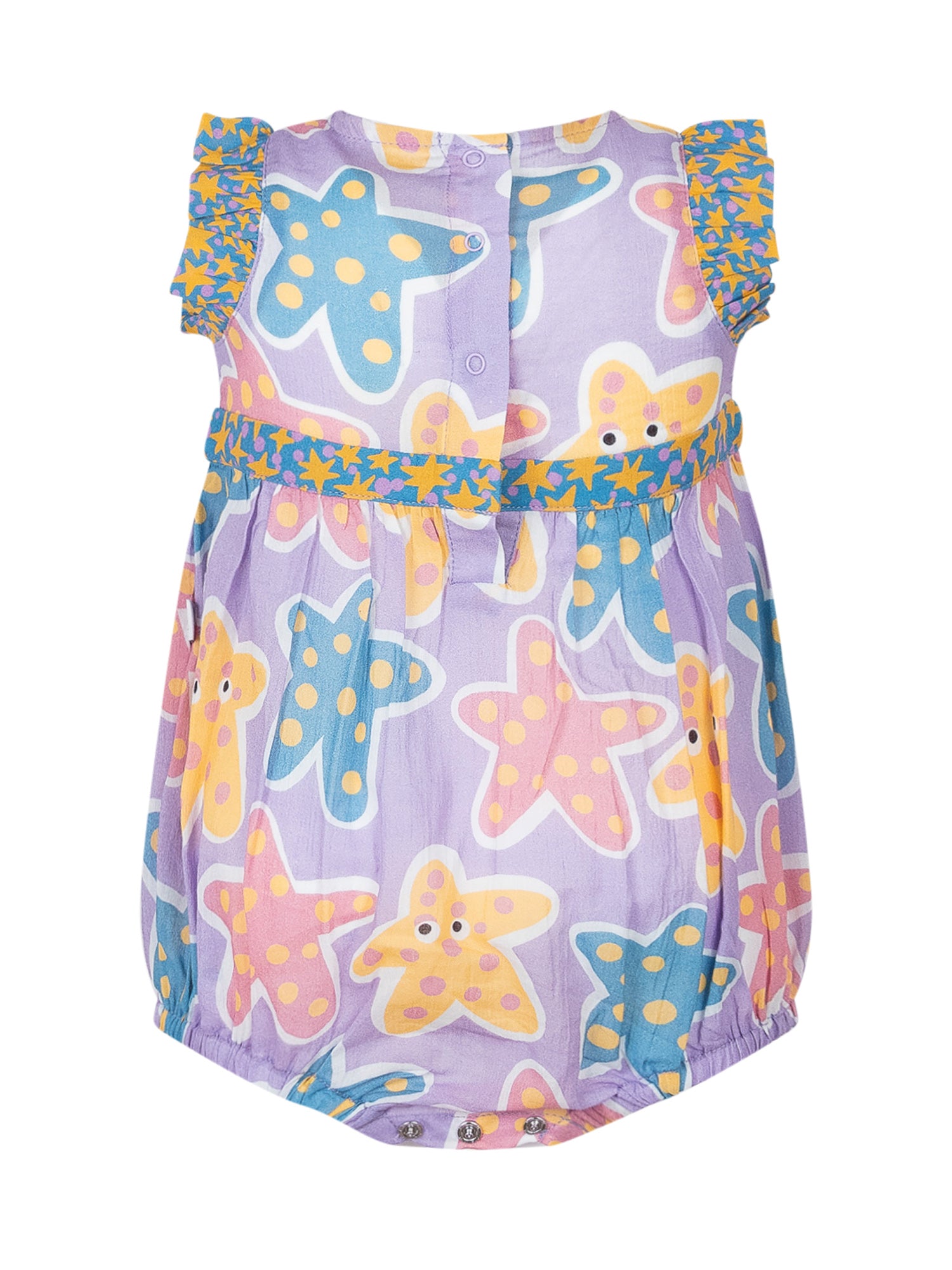 Body con maniche corte e girocollo. Modello con stampa all over a motivo stelle marine multicolore, fascia in vita a contrasto e chiusura con bottoni a pressione sul fondo. Ideale per un look fresco e vivace.