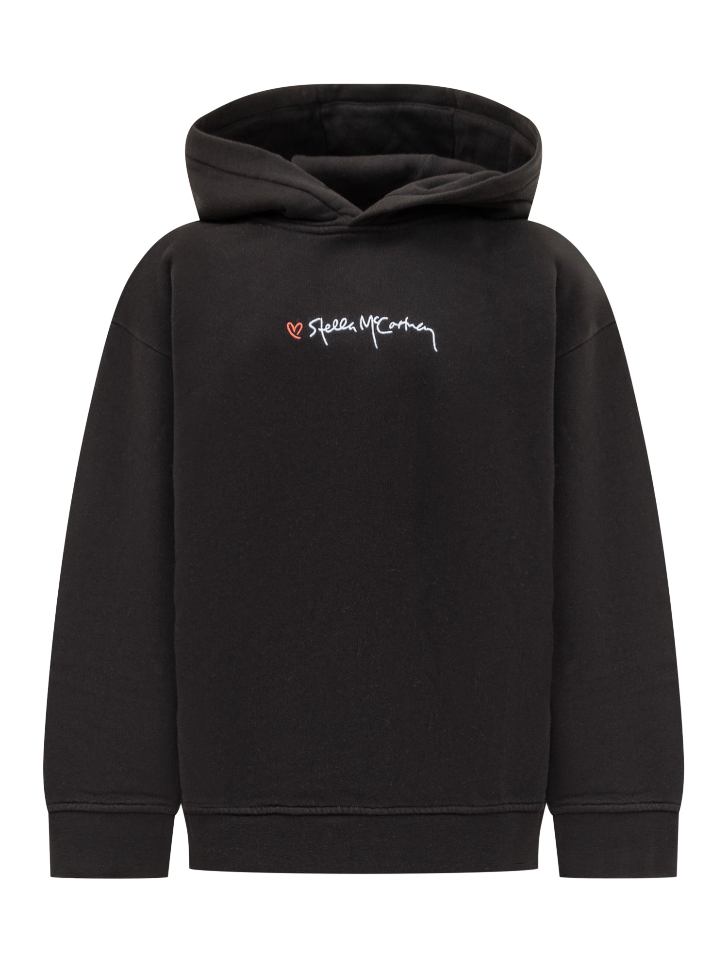 Felpa con cappuccio Stella McCartney in cotone nero con logo ricamato e piccolo cuore rosso. Stile essenziale e sostenibile.