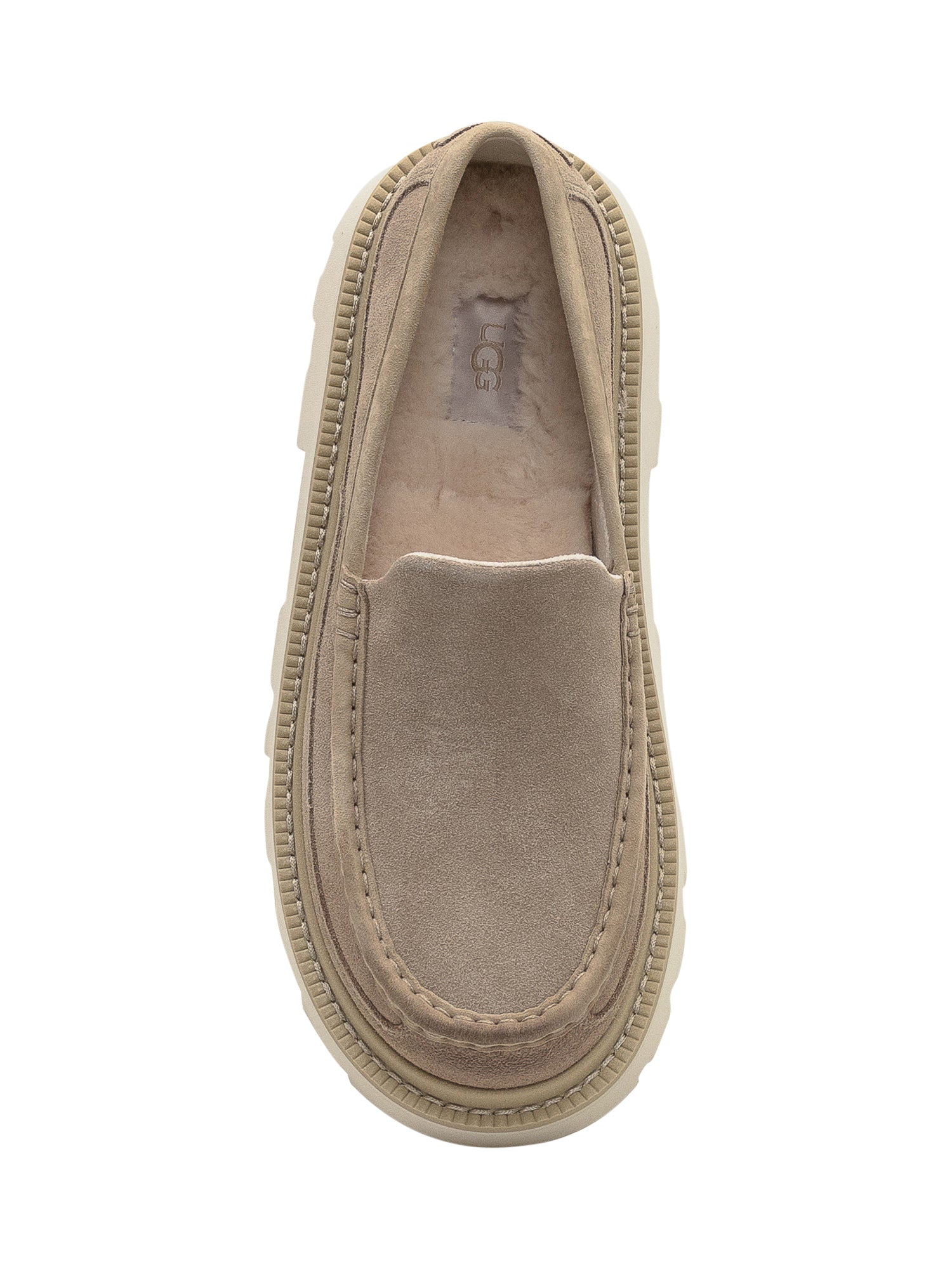 Mocassini UGG in pelle scamosciata beige con linea classica e suola chunky dentellata.