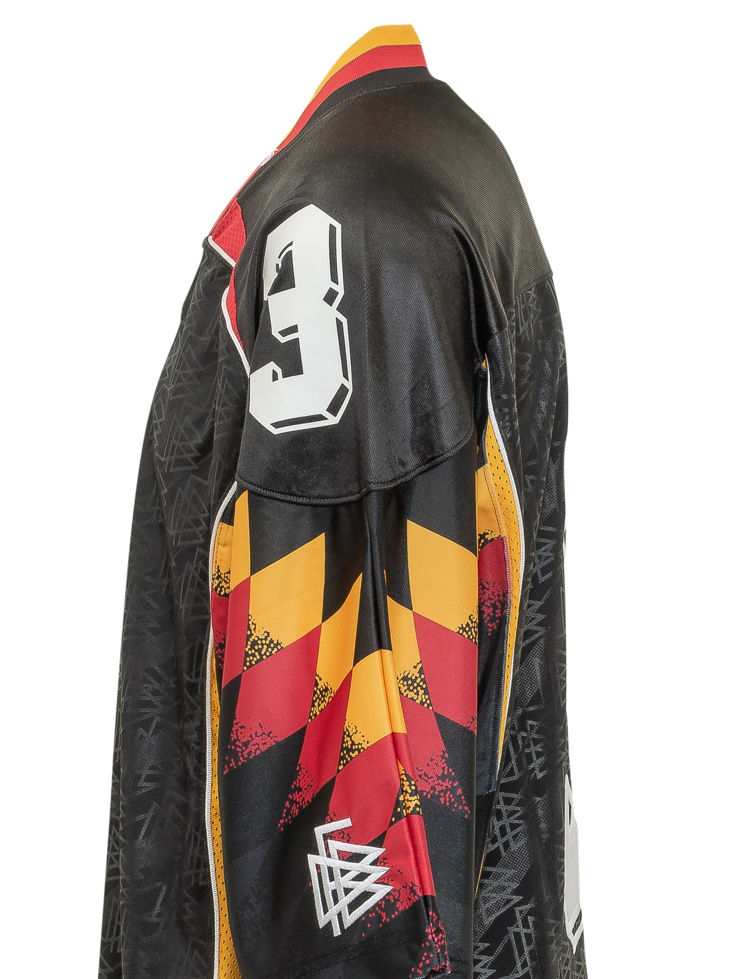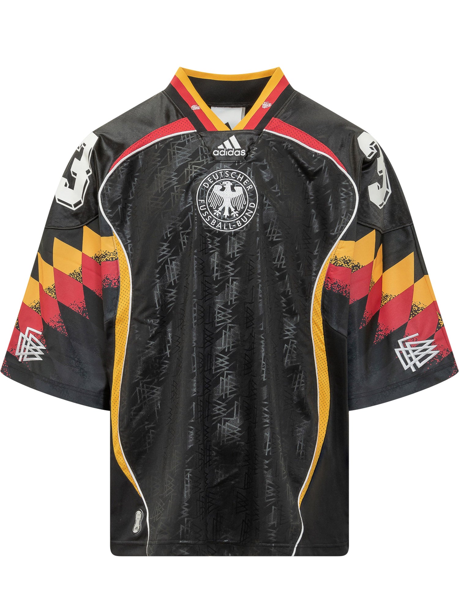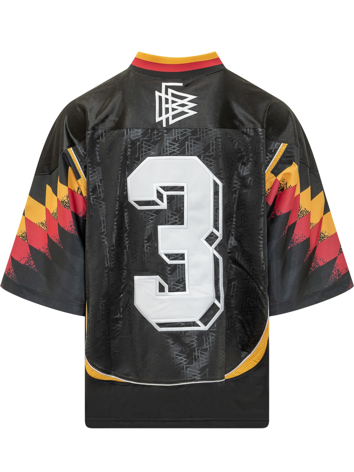 T-shirt con scollo a V e maniche corte ampie. Stampa grafica frontale e dettagli a contrasto sulle maniche.