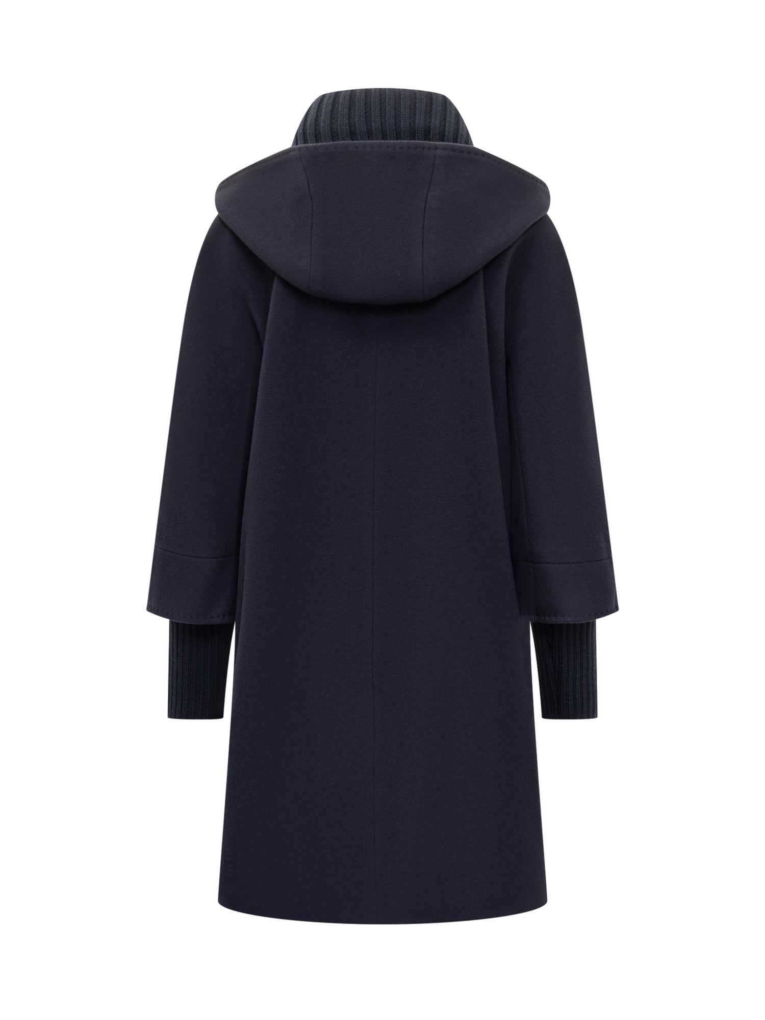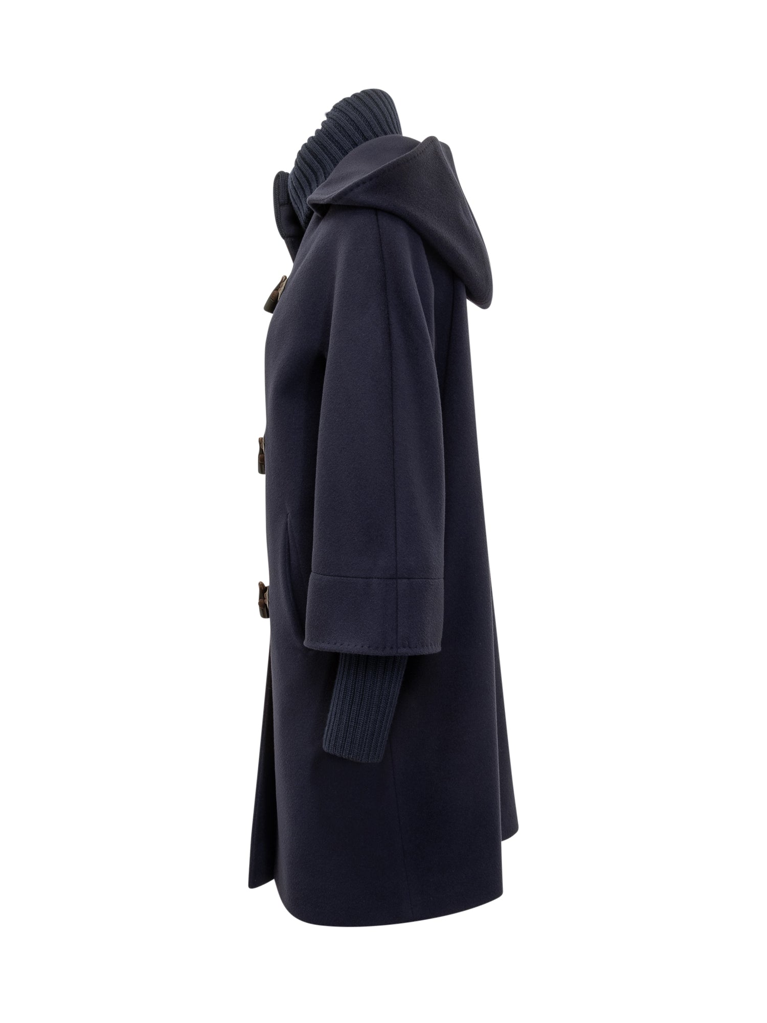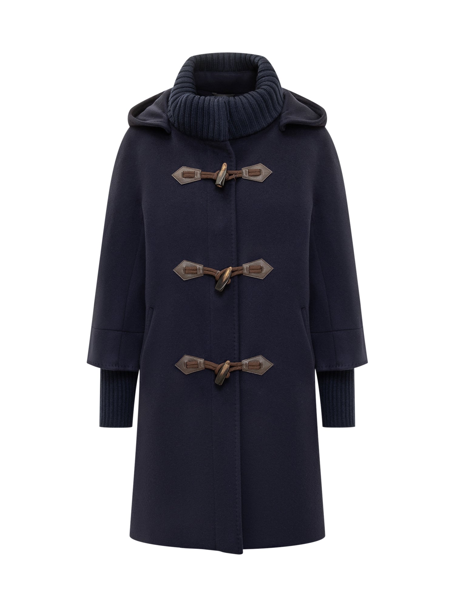 Cappotto blu Cinzia Rocca con chiusura ad alamari in pelle, collo in maglia e dettagli sartoriali.
