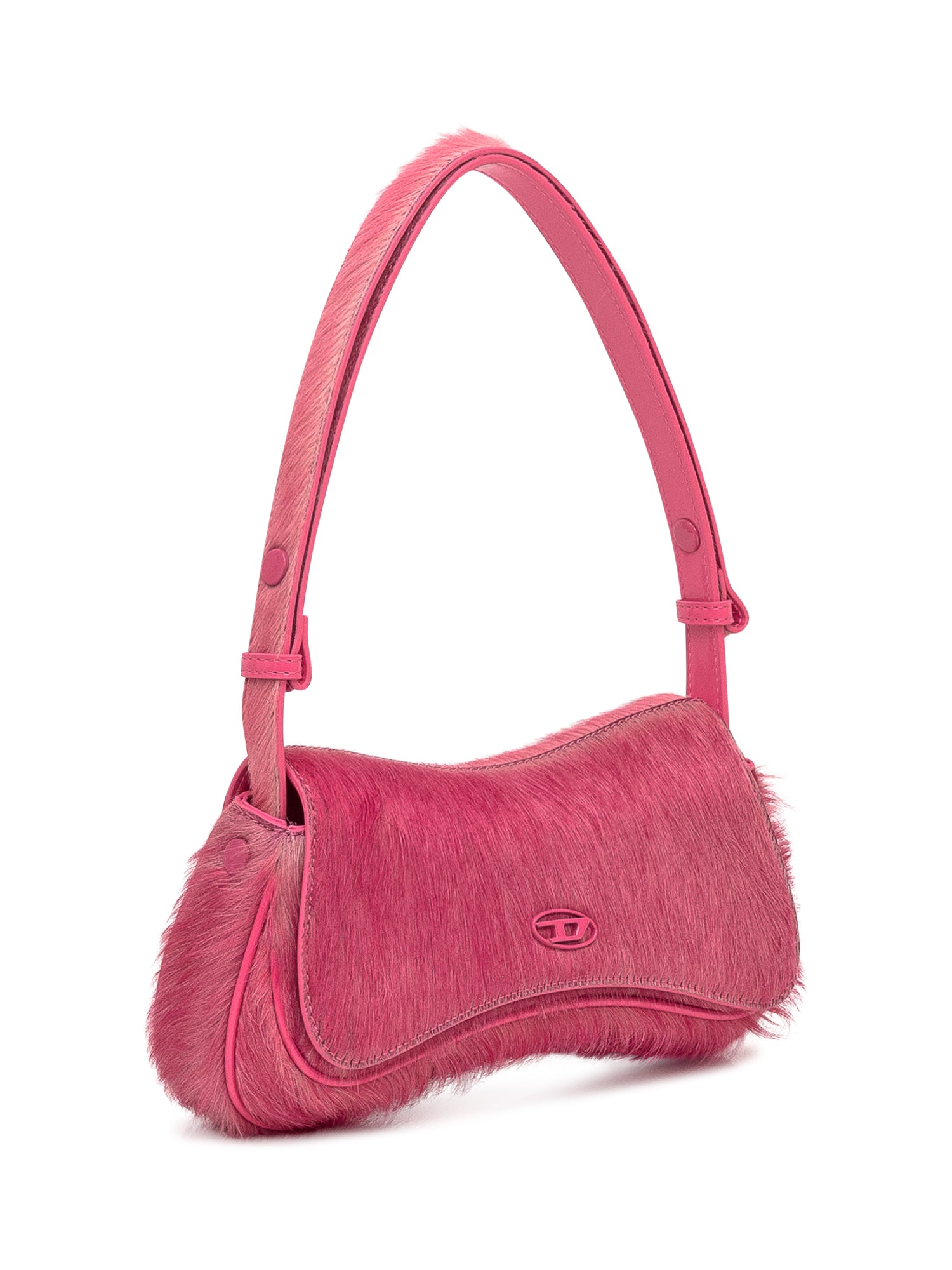 Borsa a spalla Diesel in pelliccia sintetica rosa con logo tono su tono e silhouette curva.