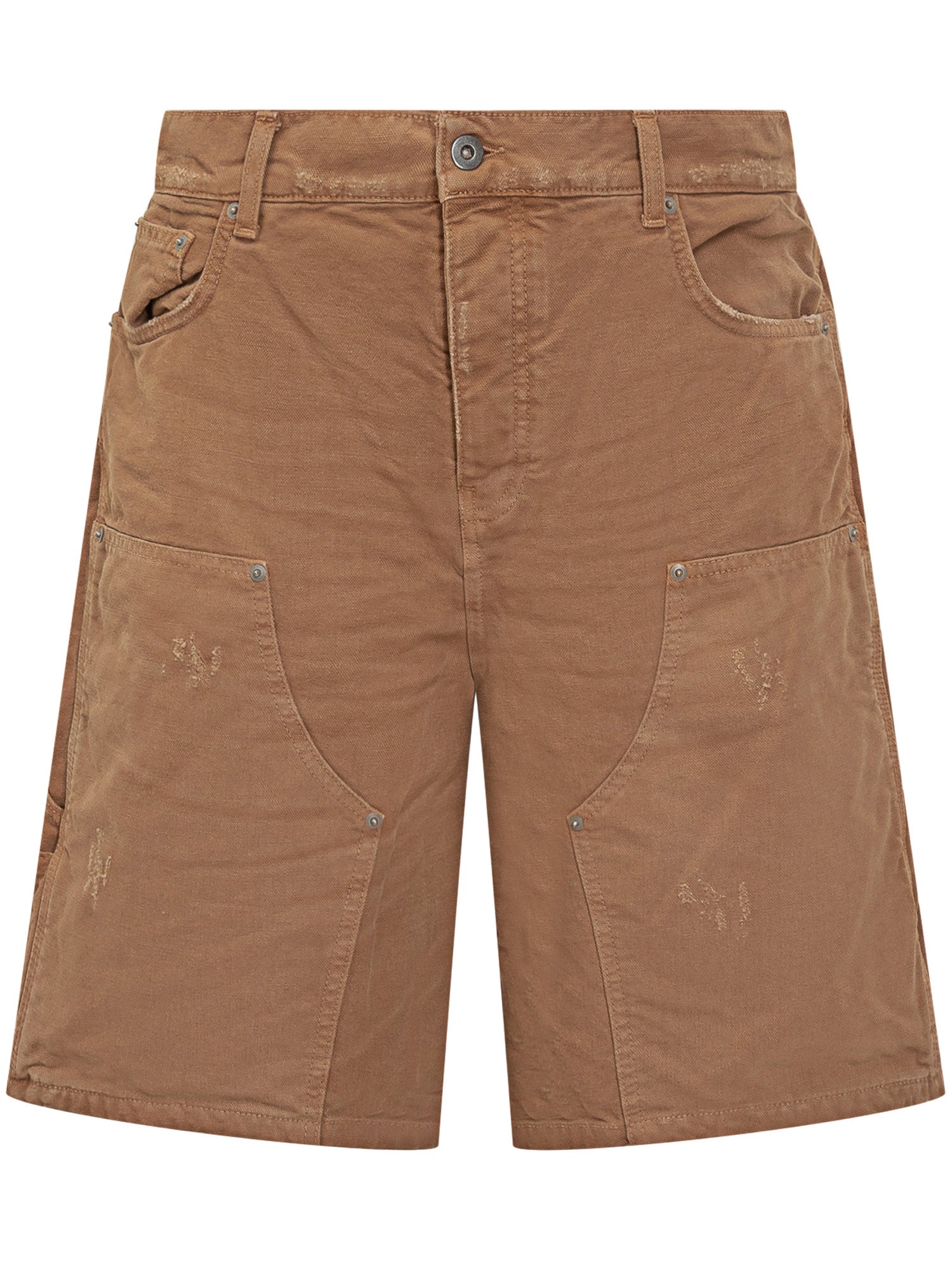 Short marrone in cotone. Passanti per cintura. Cinque tasche. Chiusura bottoni. Logo patch.