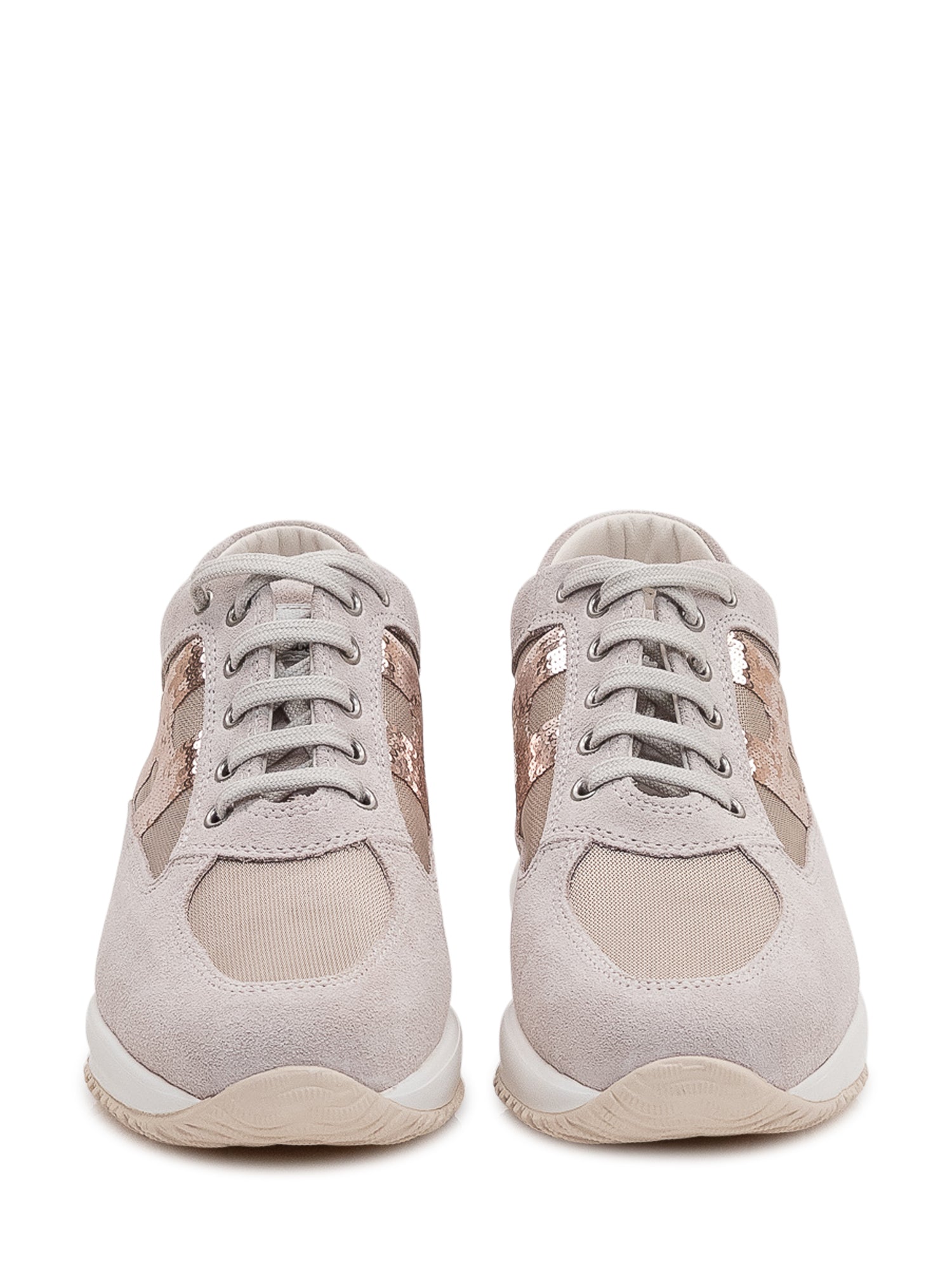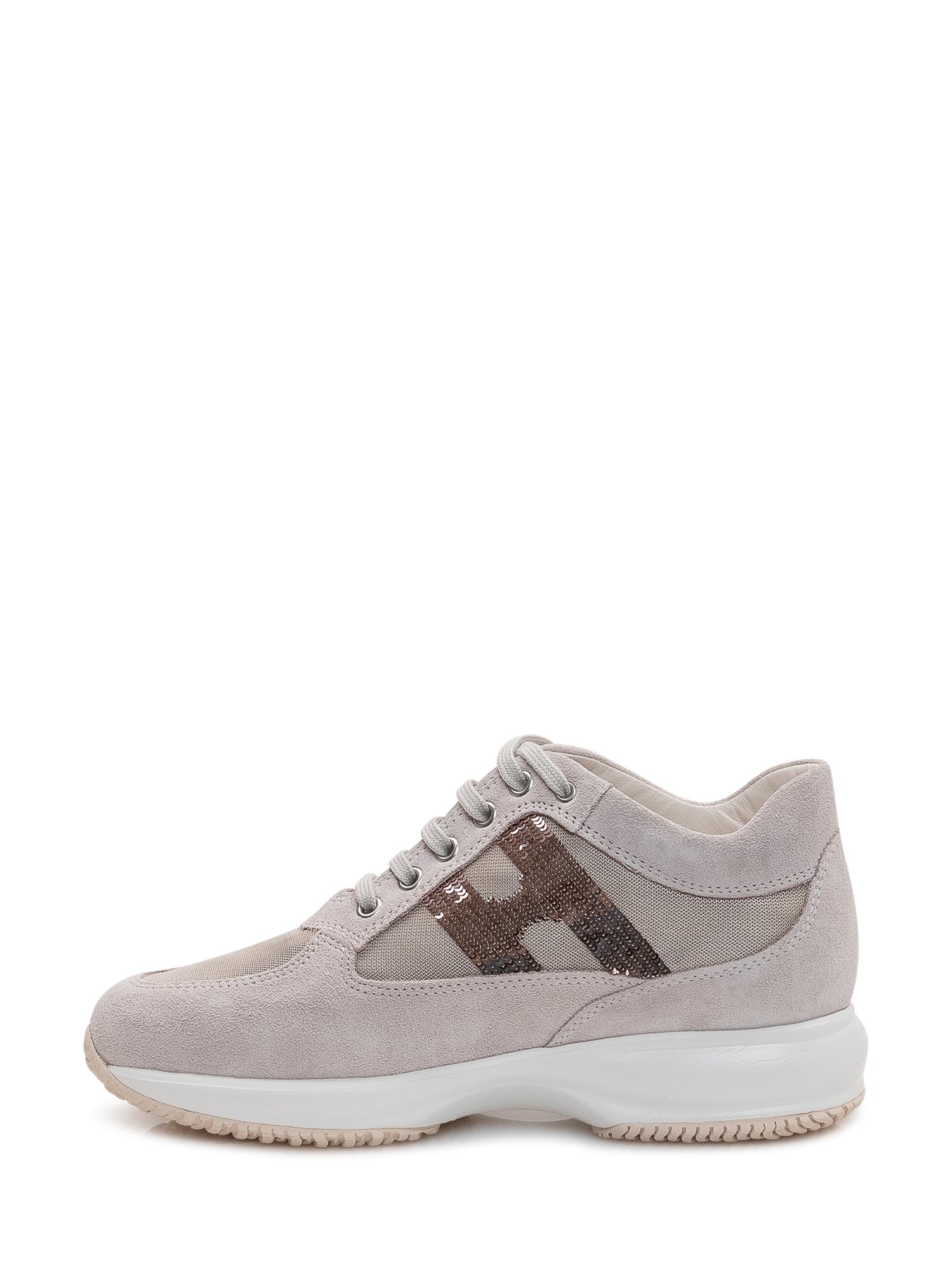 Sneakers in suede e tessuto con inserto laterale a paillettes, design sportivo e contemporaneo.