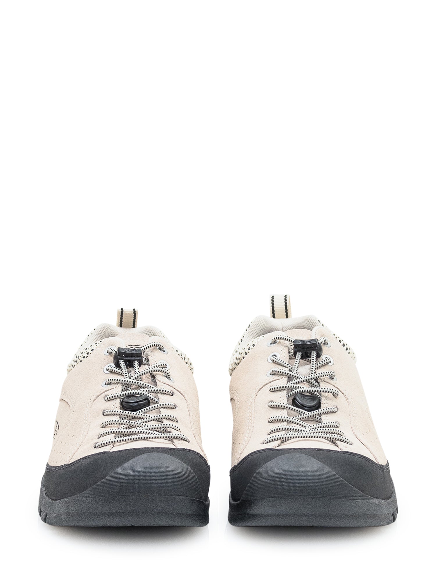 Sneaker Keen Jasper Rocks in camoscio beige con rinforzi neri e inserti traforati. Suola robusta e chiusura pratica per comfort e stabilità.
