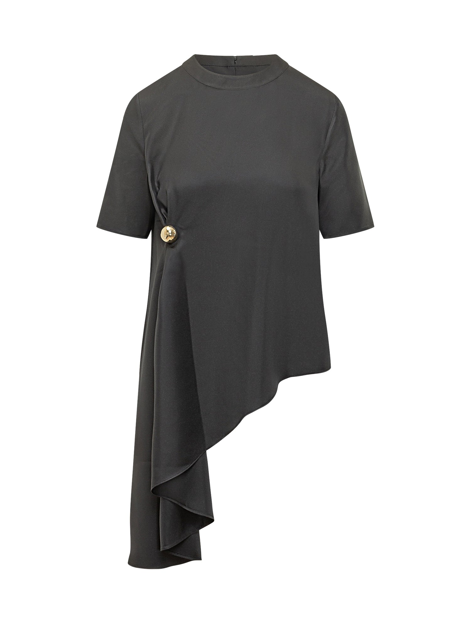 Top da donna con collo alto, manica corta e linea morbida, drappeggio laterale con dettaglio bottone, orlo asimmetrico con balza fluida.