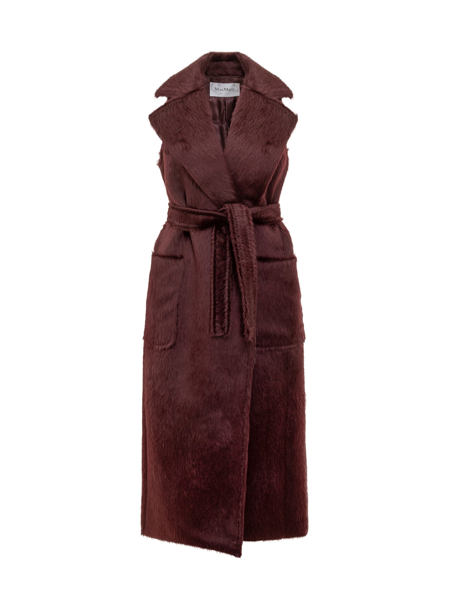 Gilet lungo Max Mara in morbida lana bordeaux con revers ampi, tasche applicate e cintura coordinata in vita.