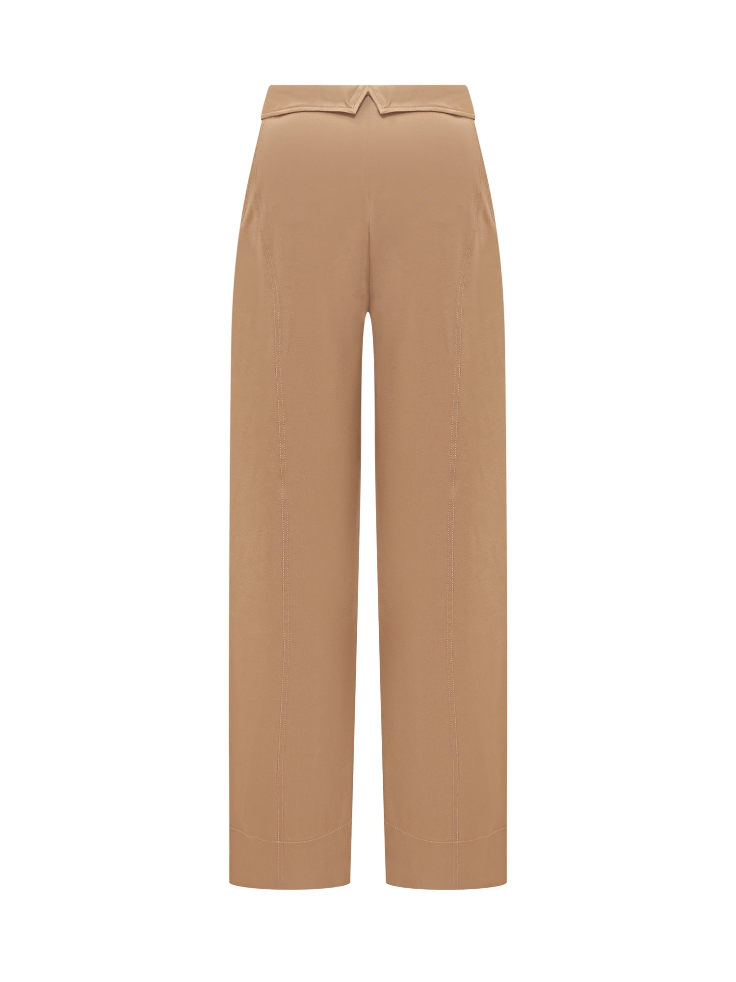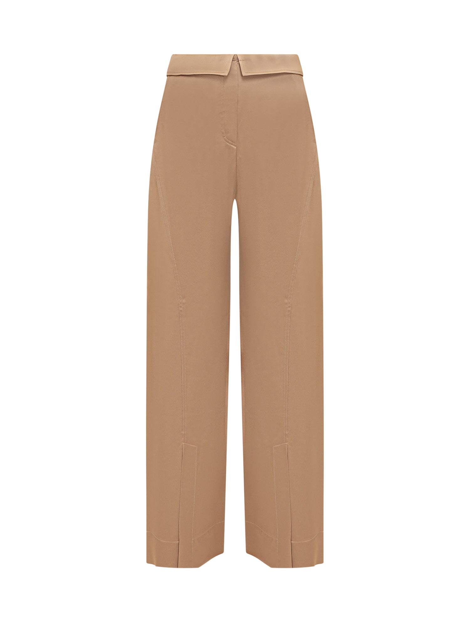 Pantalone lungo in satin di viscosa. Chiusura con zip e gancino. Due tasche laterali. Maxi cuciture all-over. Spacchi sul davanti. Orlo in vita con piega.
