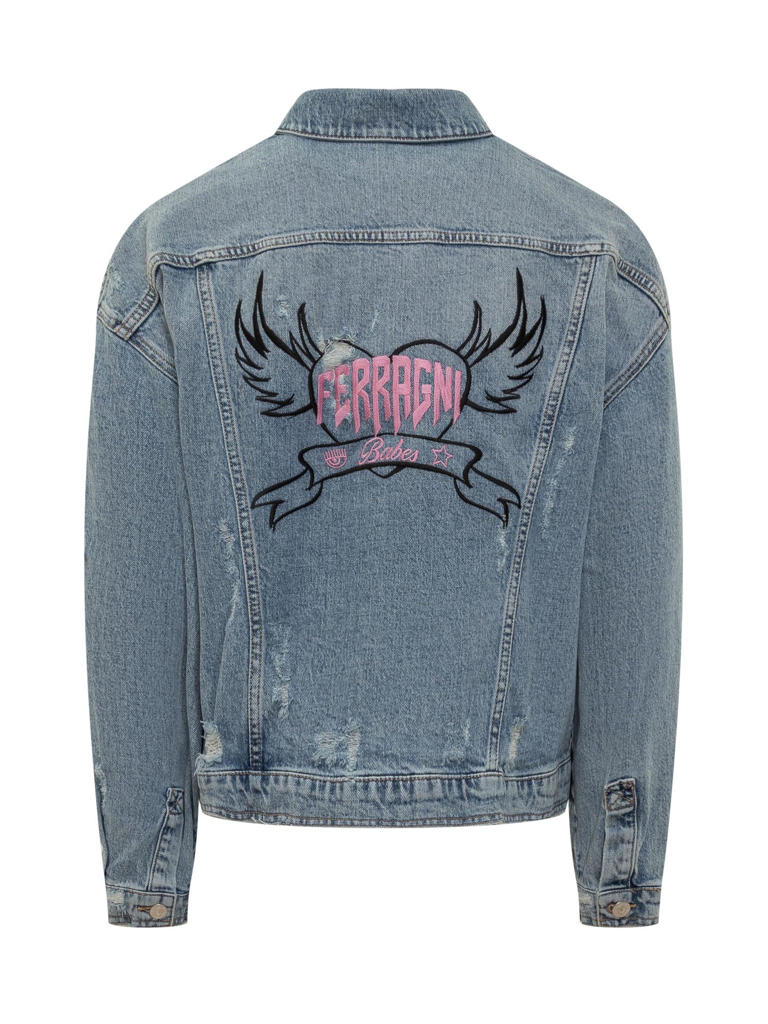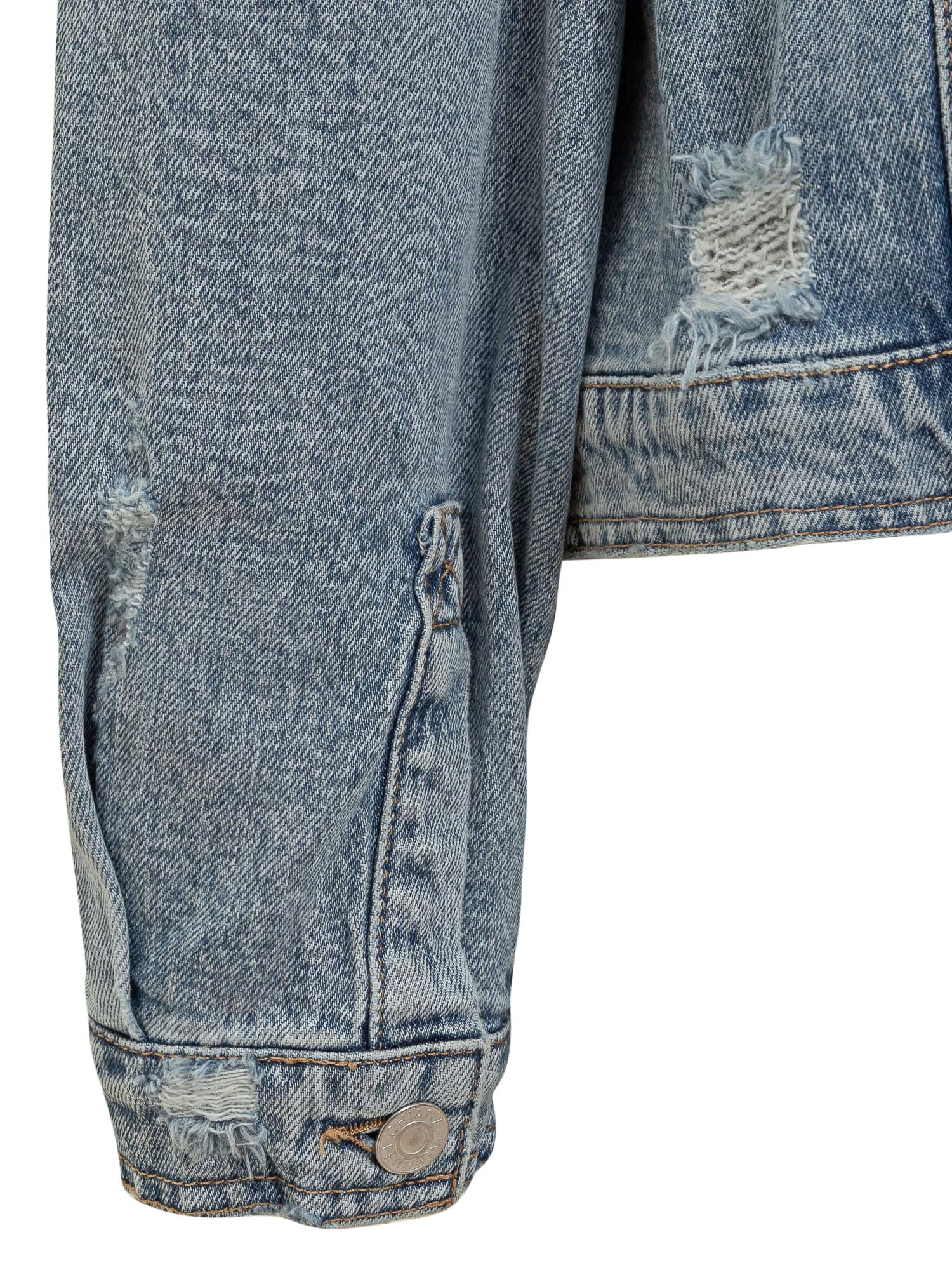 Giubbino in jeans a maniche lunghe. Girocollo. Collo classico. Chiusura con bottoni. Polsi con bottoni. Quattro tasche sul davanti. Effetto rovinato all-over. logo Punk ricamato sul retro.