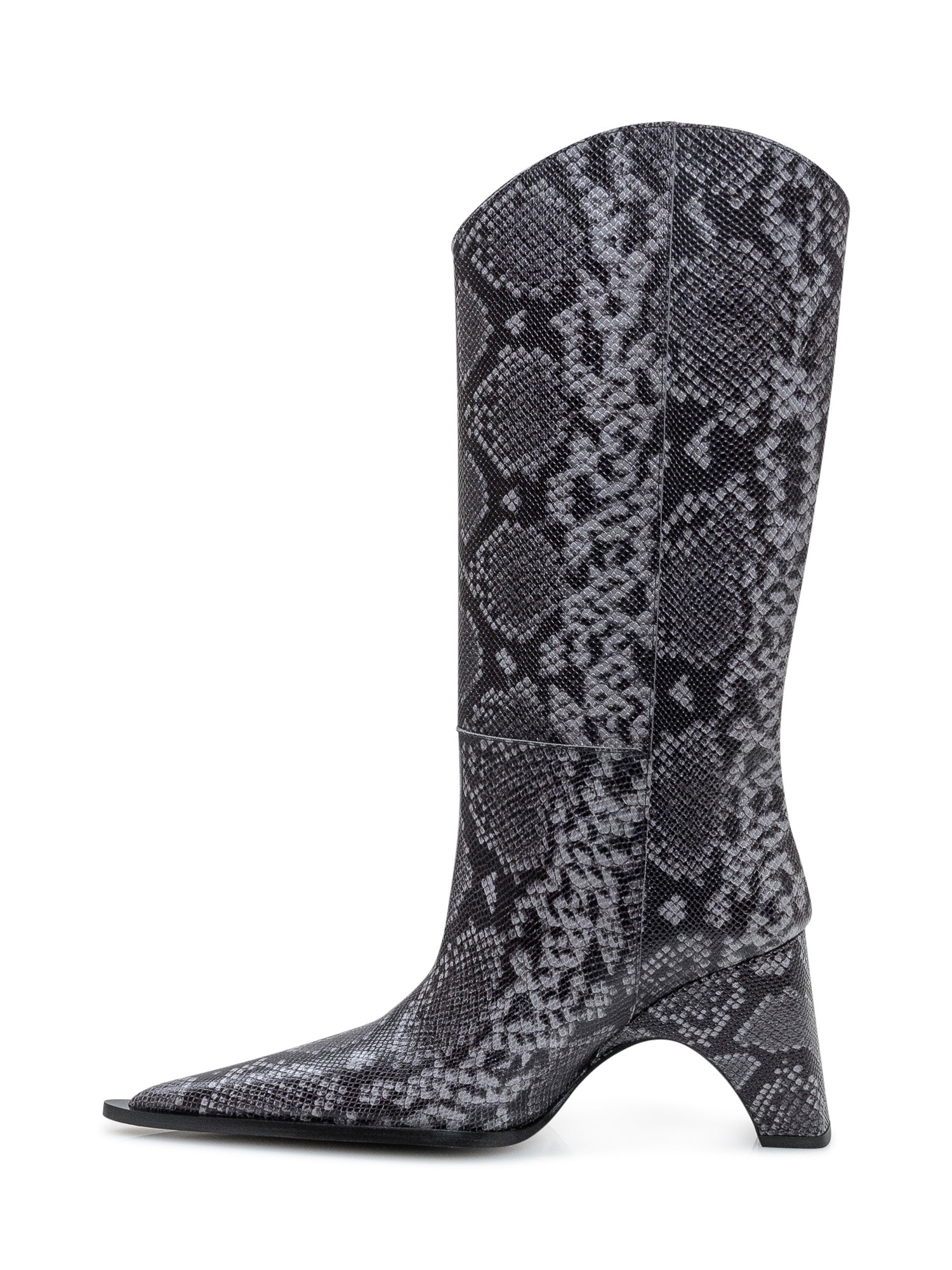 Stivali Coperni Cowboy Bridge con stampa pitone, punta affusolata e tacco scultoreo. Un modello audace che unisce ispirazione western e design.