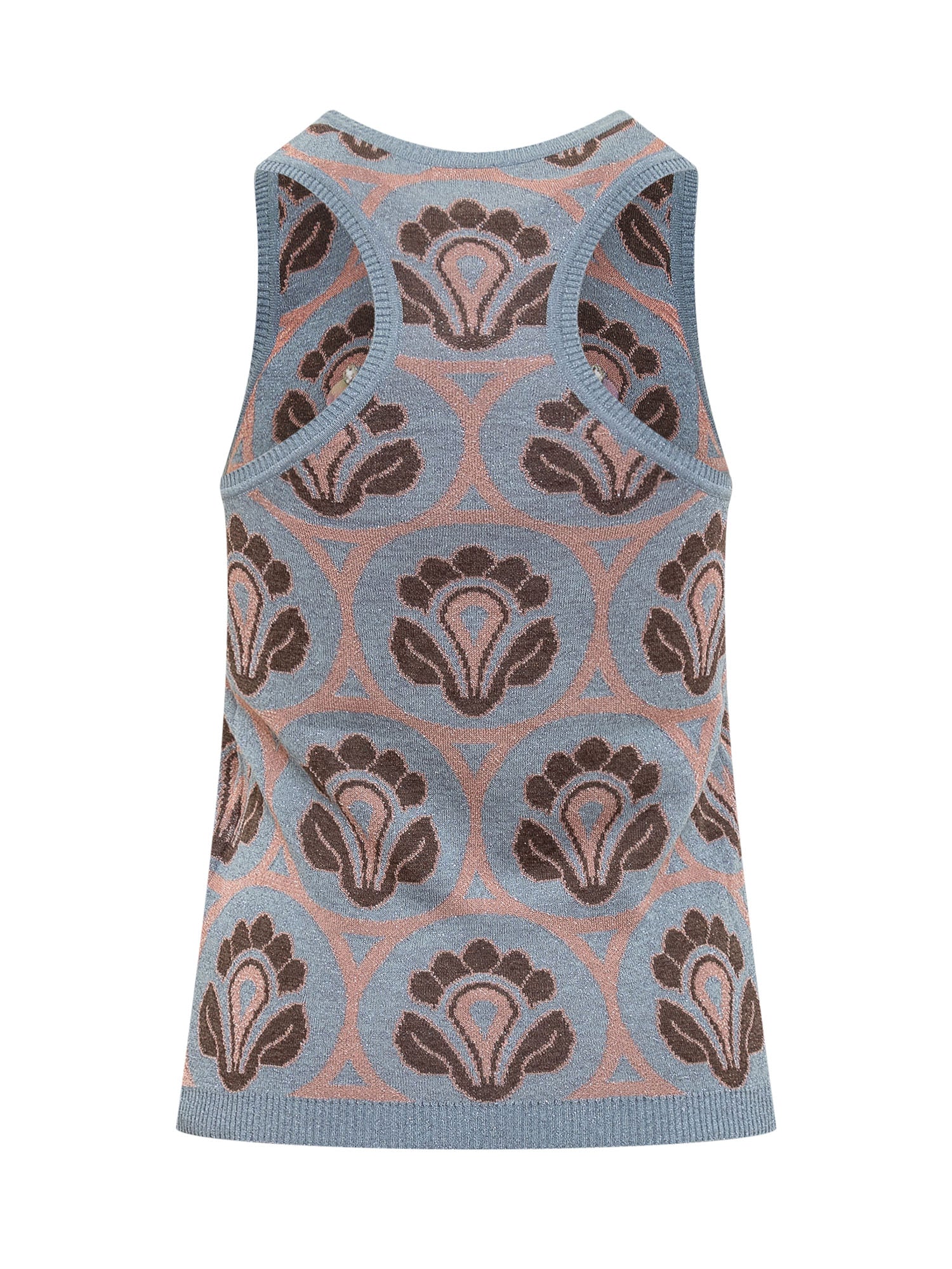 Top smanicato in maglia jacquard. Girocollo. Orli a costine. Motivo Aurea con piume e strass applicati.