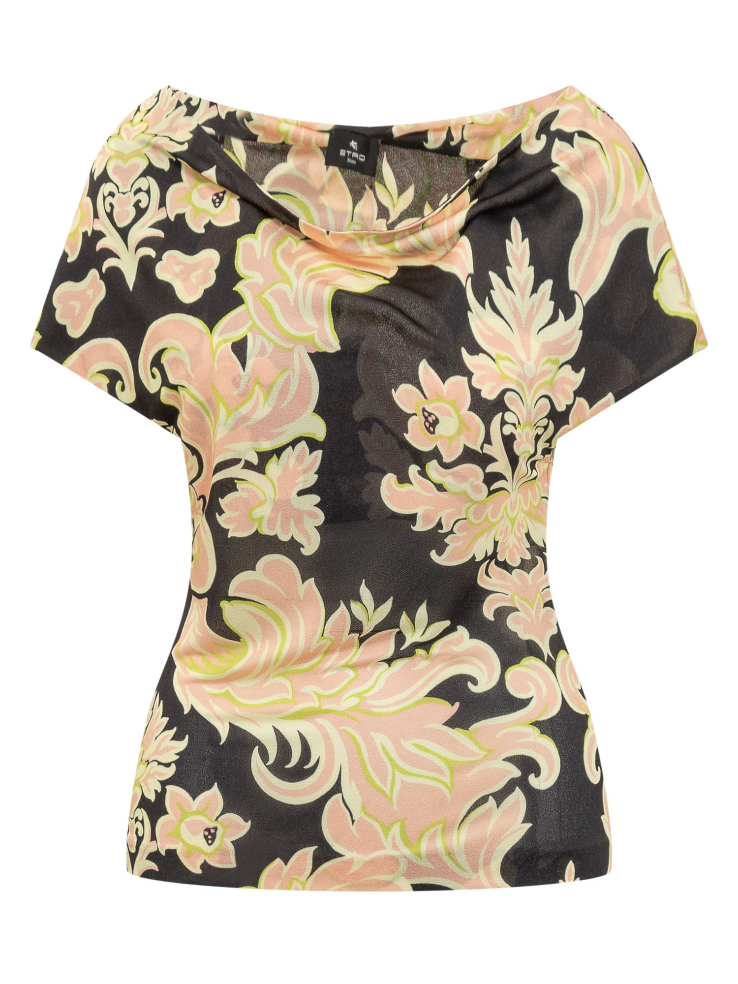 Top a maniche corte in viscosa. Scollo drappeggiato. Stampa Venus all over. Semi trasparente.