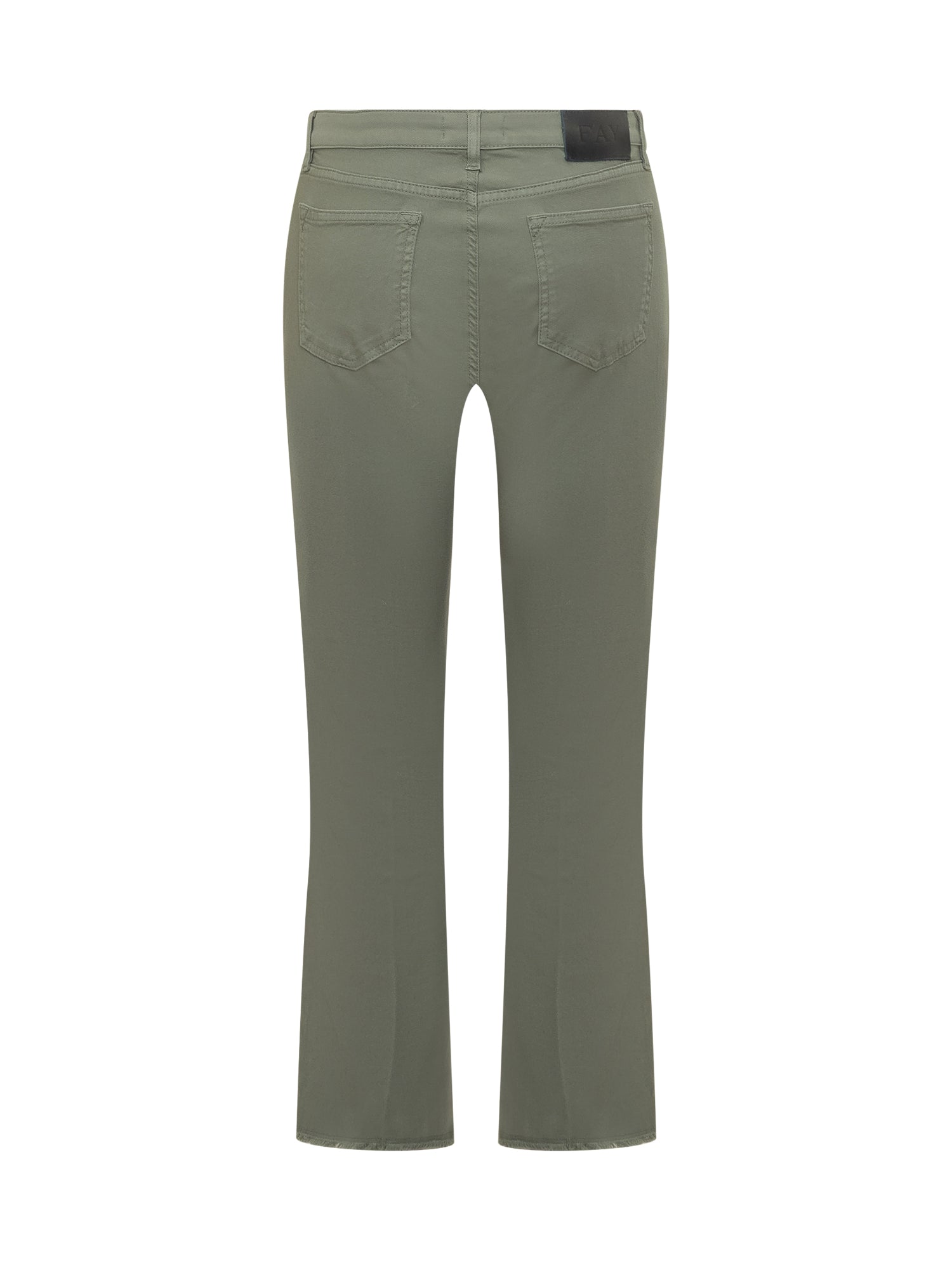 Chiusura con bottone e zip. Cinque tasche. Gamba svasata.