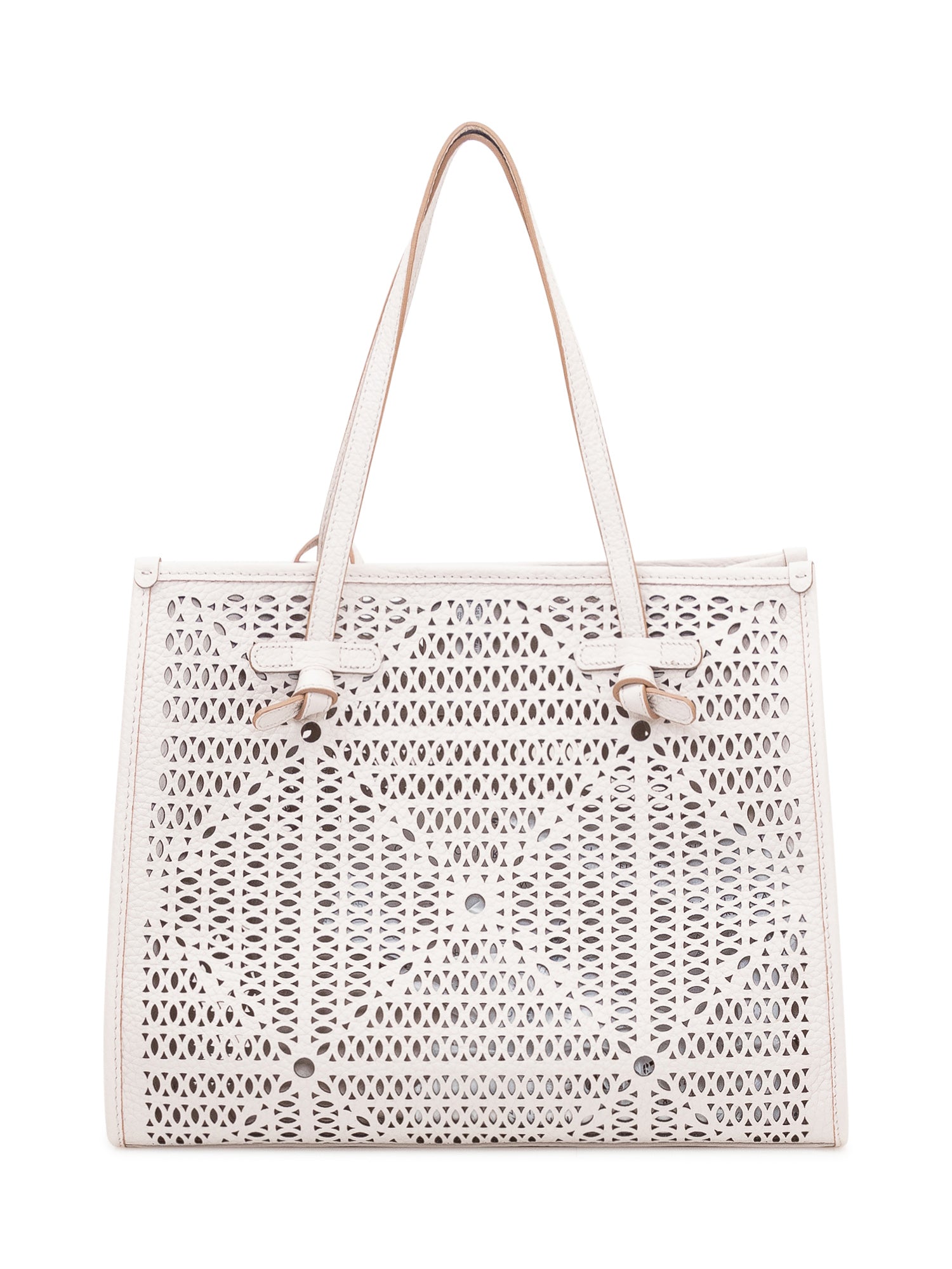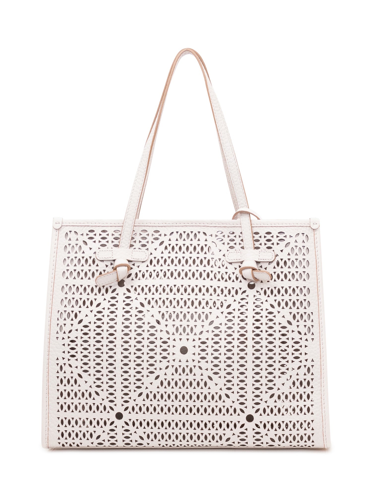Borsa a mano con struttura ampia, lavorazione traforata e doppi manici, design funzionale e capiente con dettagli annodati