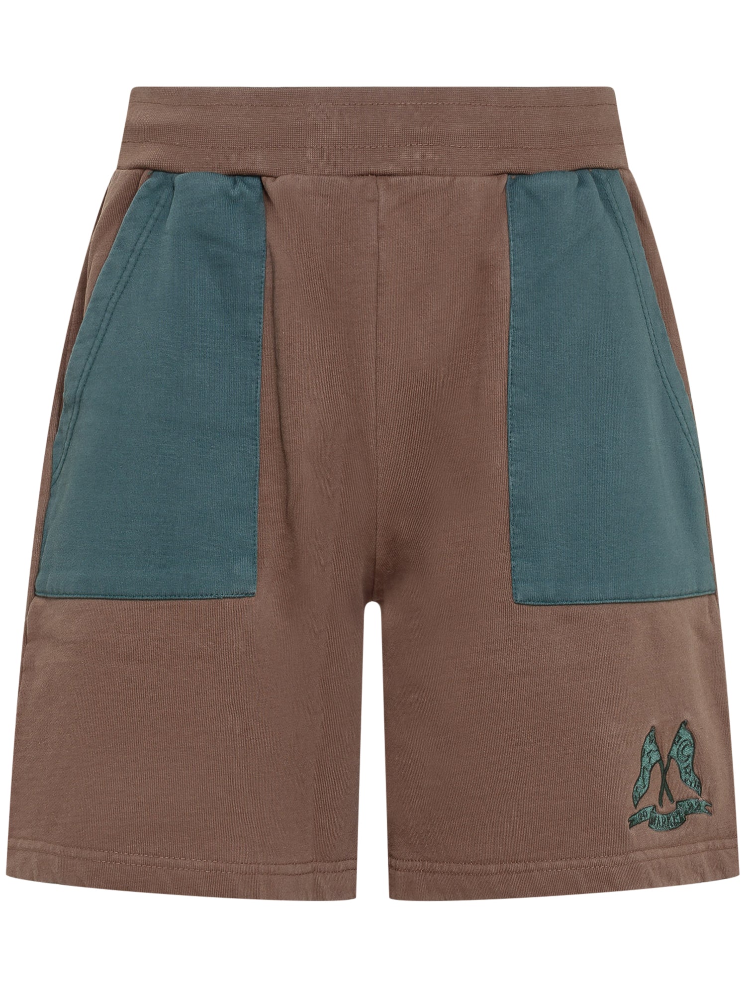 Pantaloni corti della tuta marroni. Elastico in vita. Tasche laterali e sul retro. Logo sulla tasca posteriore. Logo ricamato sul davanti.