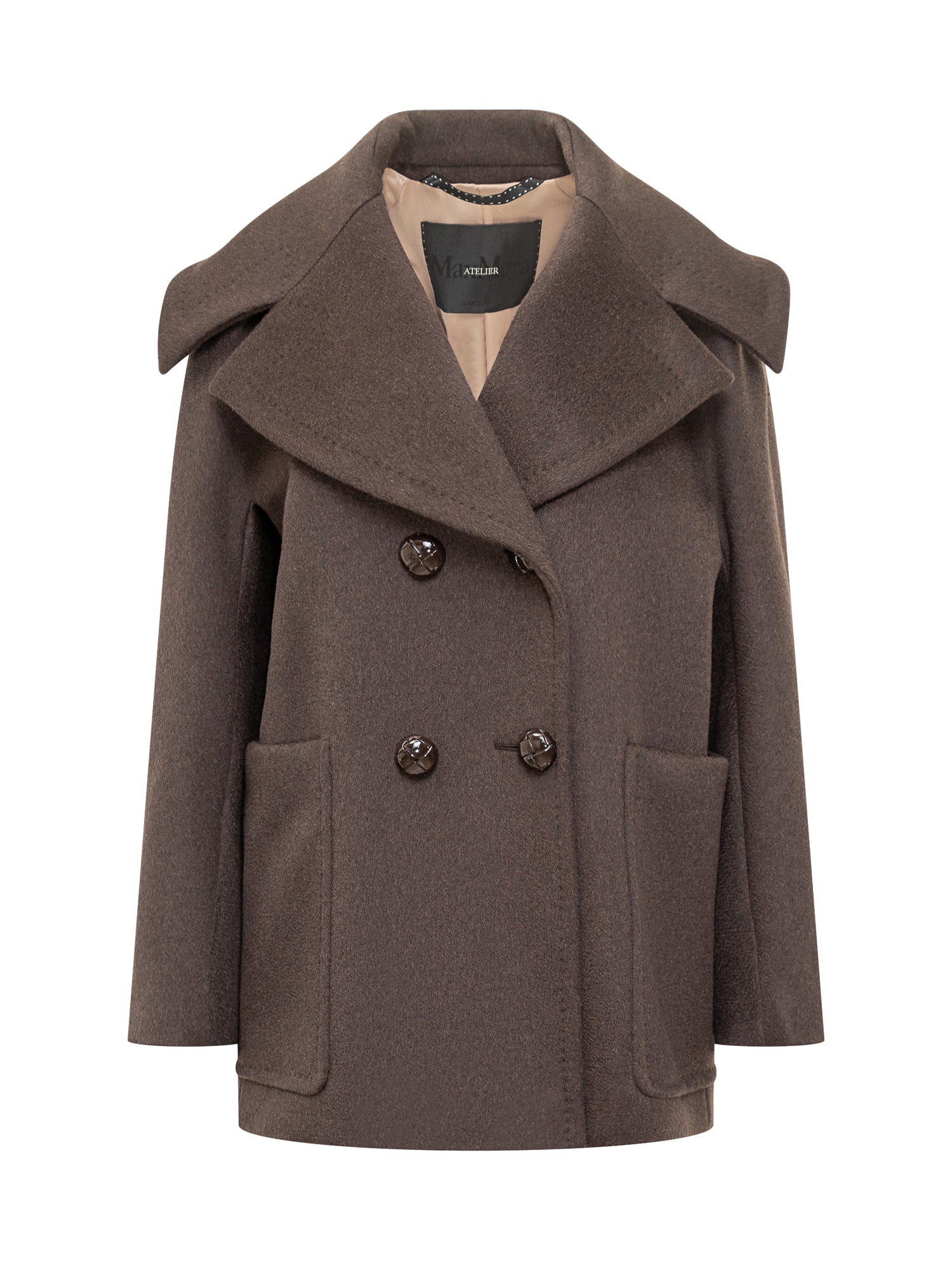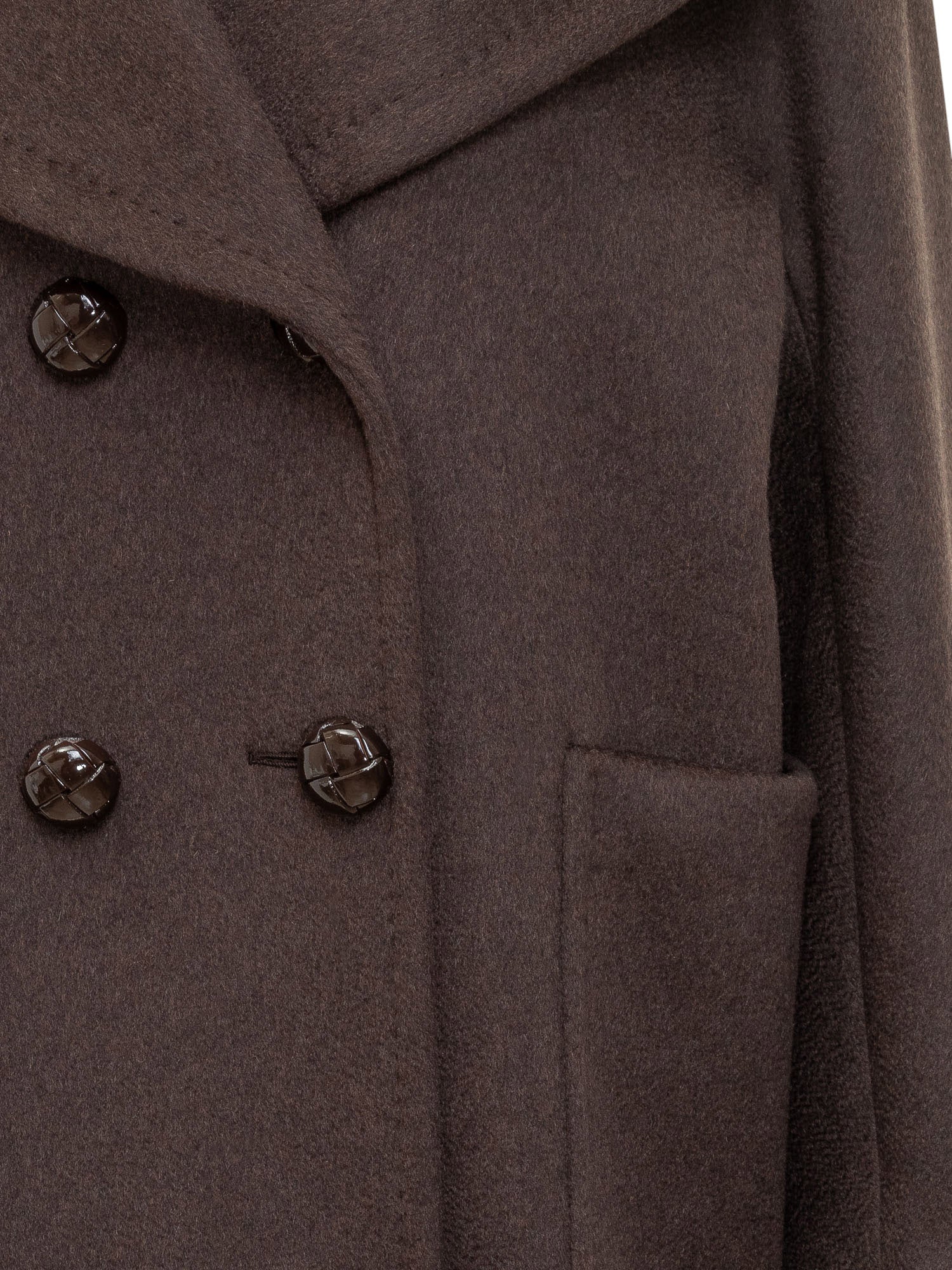 Cappotto corto Max Mara Atelier in lana marrone con chiusura doppiopetto e ampi revers. Tasche applicate e linea morbida.