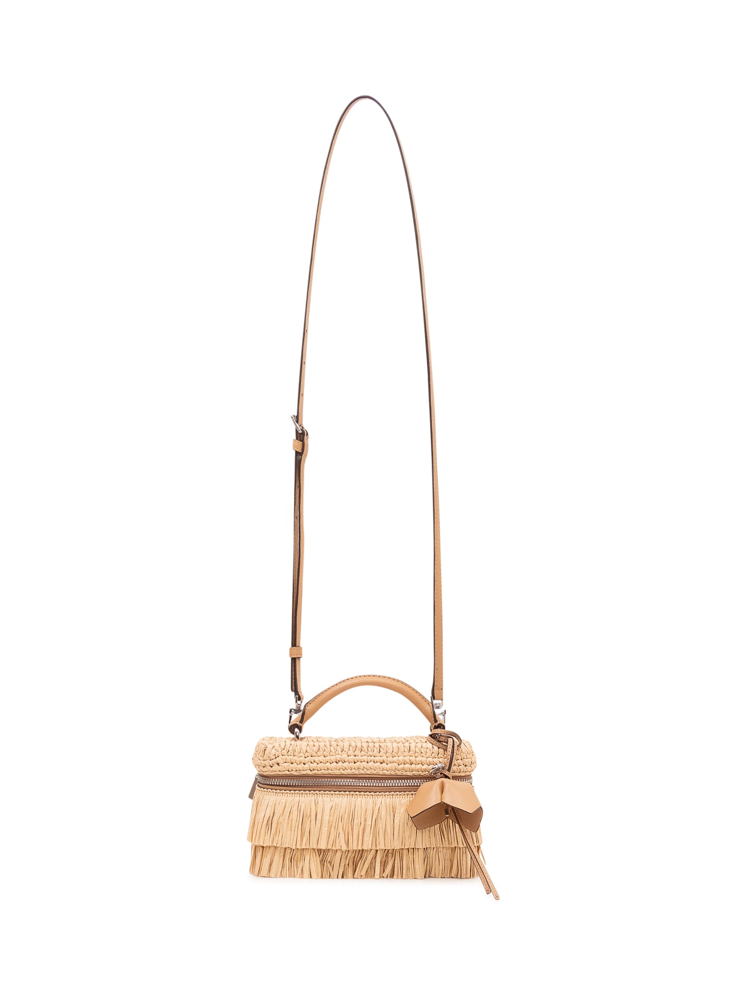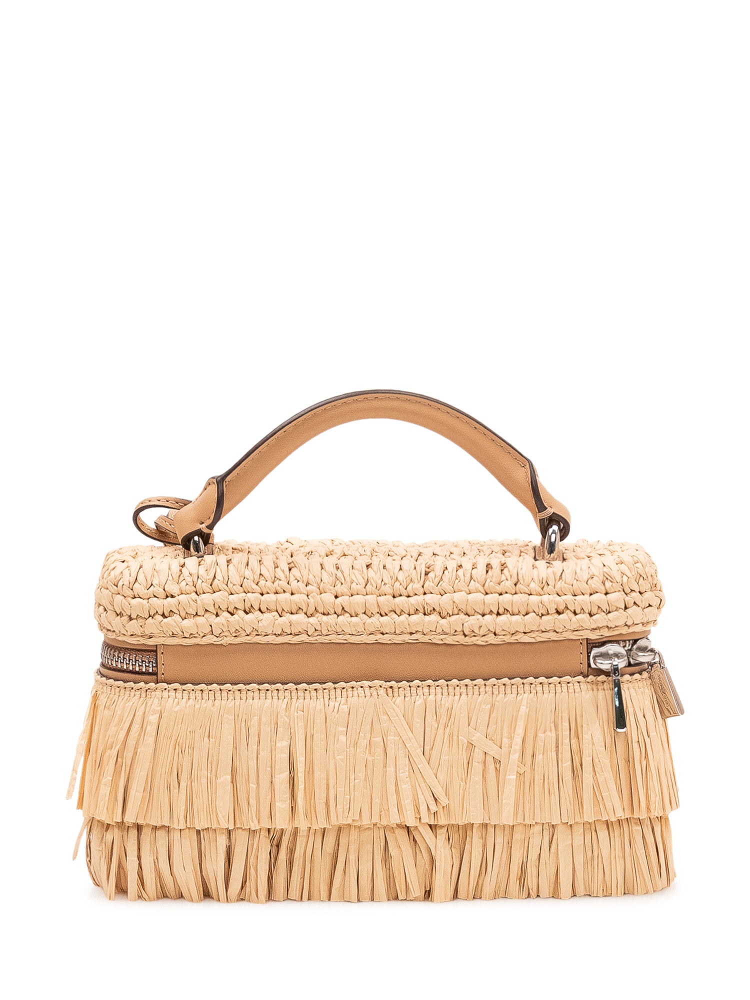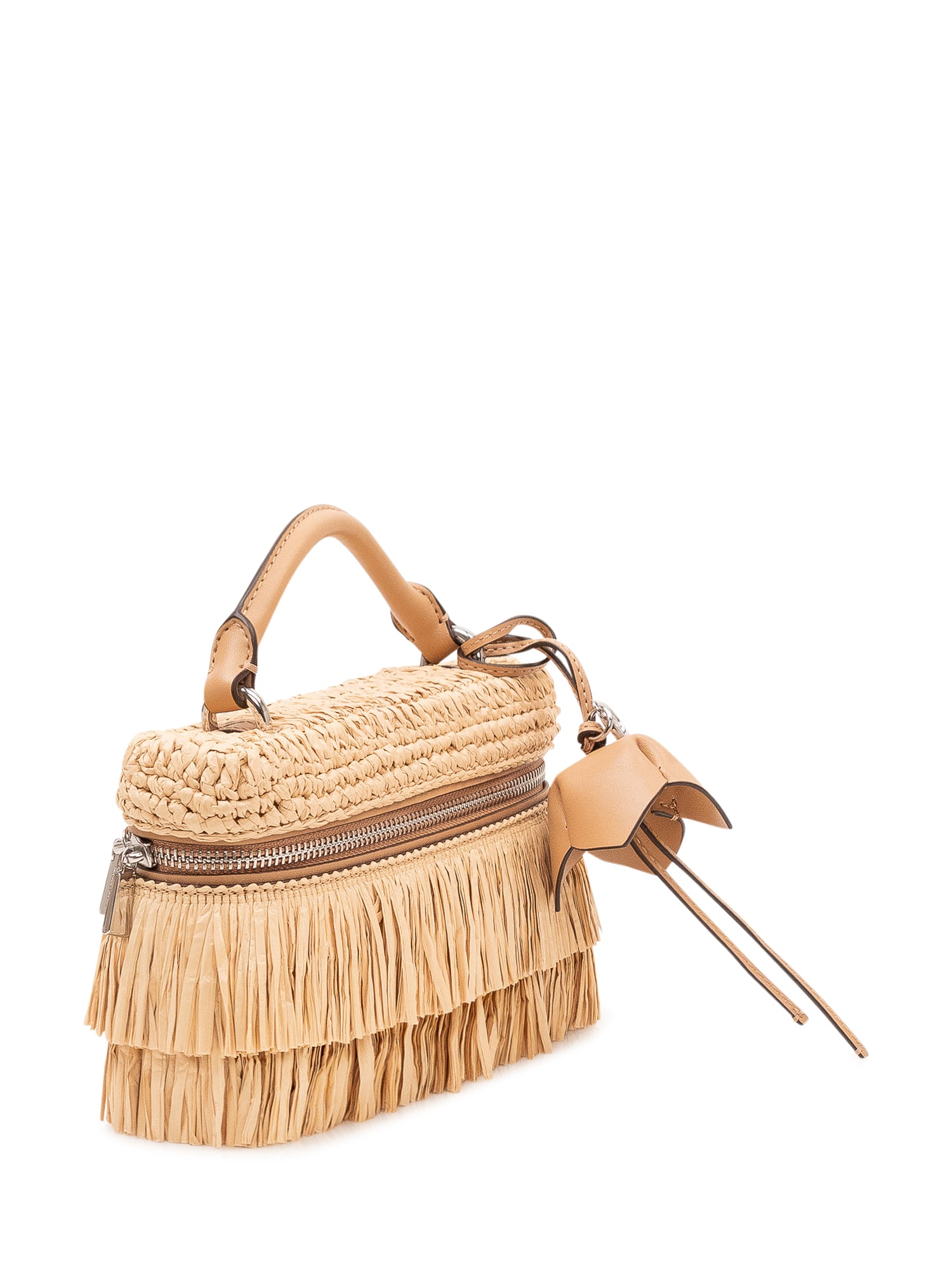 Borsa a mano con struttura intrecciata, manico superiore, chiusura con zip e dettagli di frange, arricchita da charm decorativo pendente