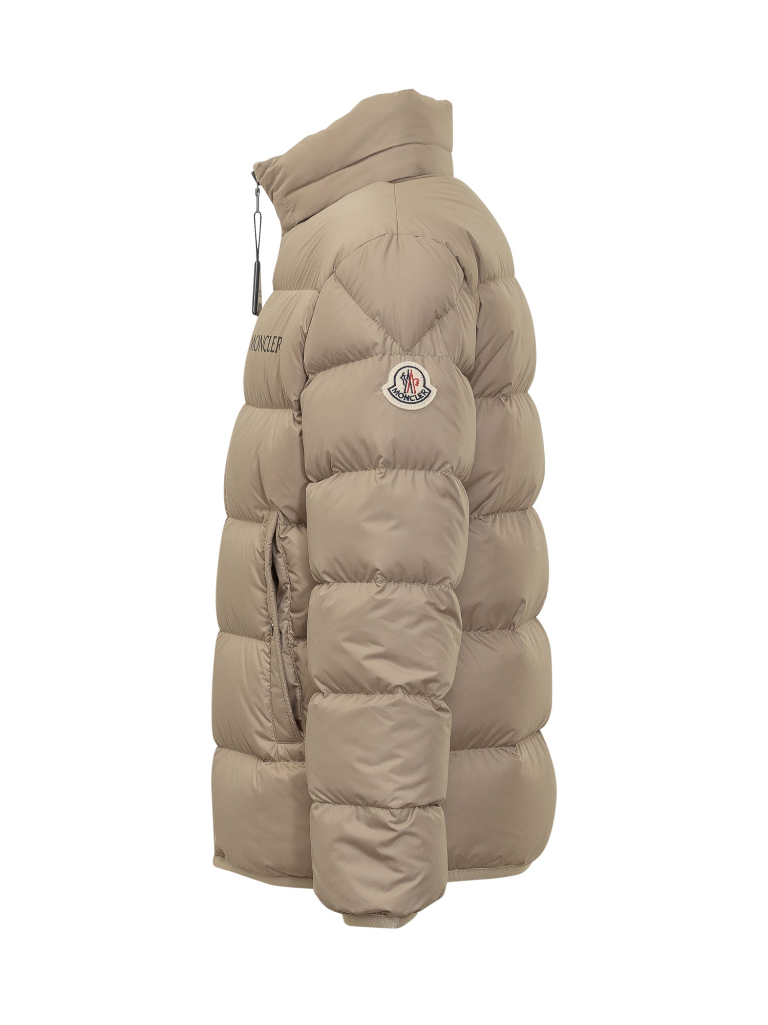 Piumino Moncler Bajan da bambino in beige chiaro, con logo frontale e zip a tutta lunghezza.