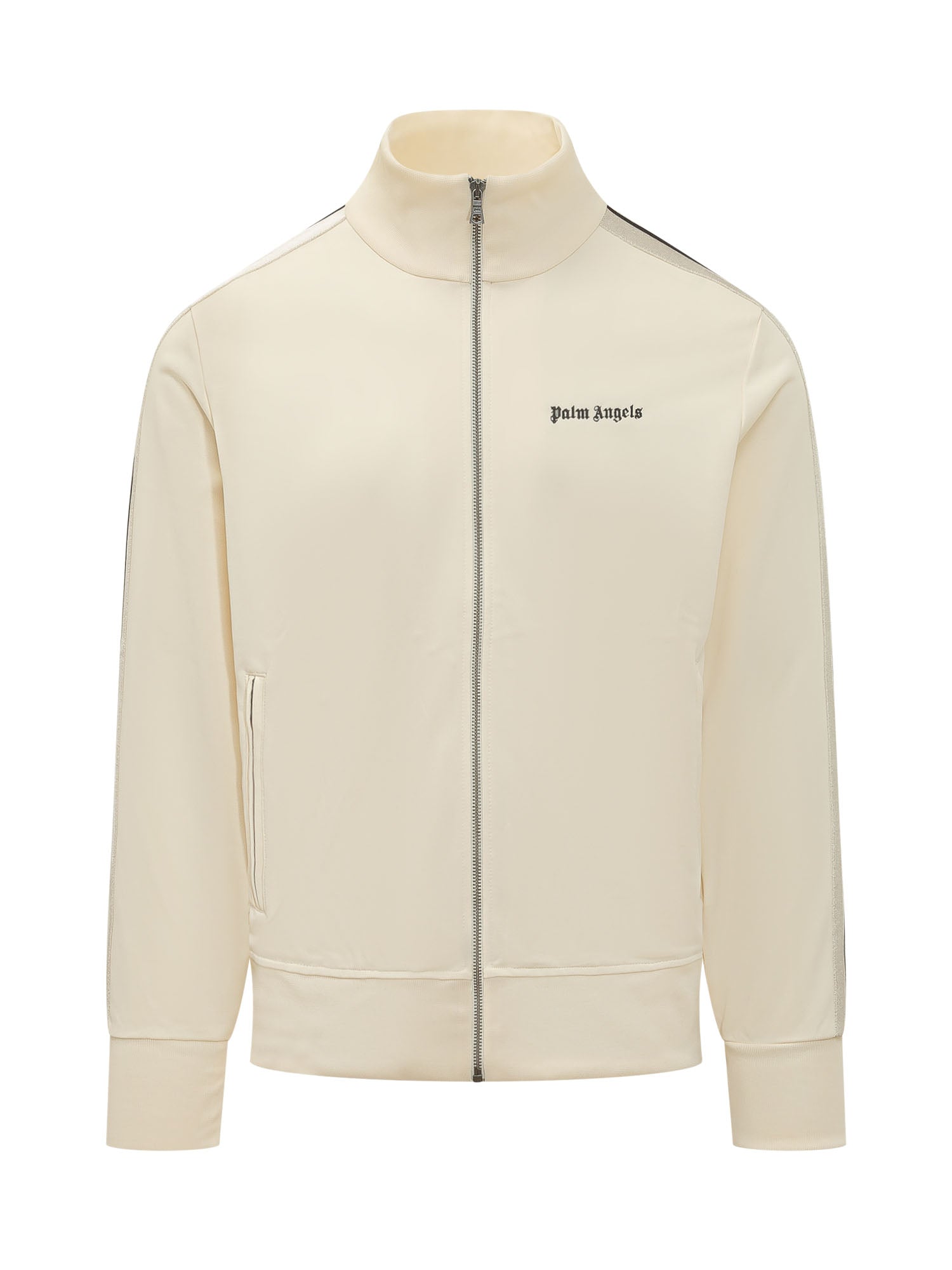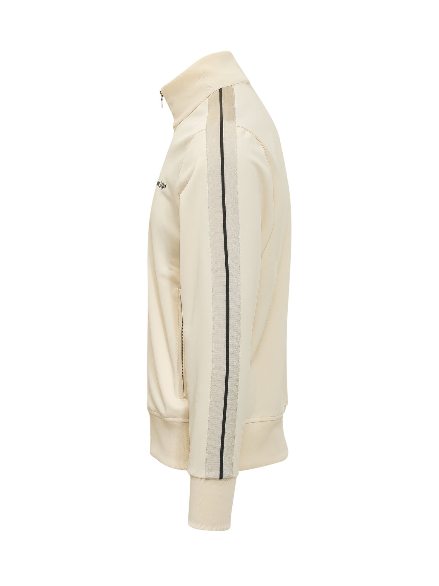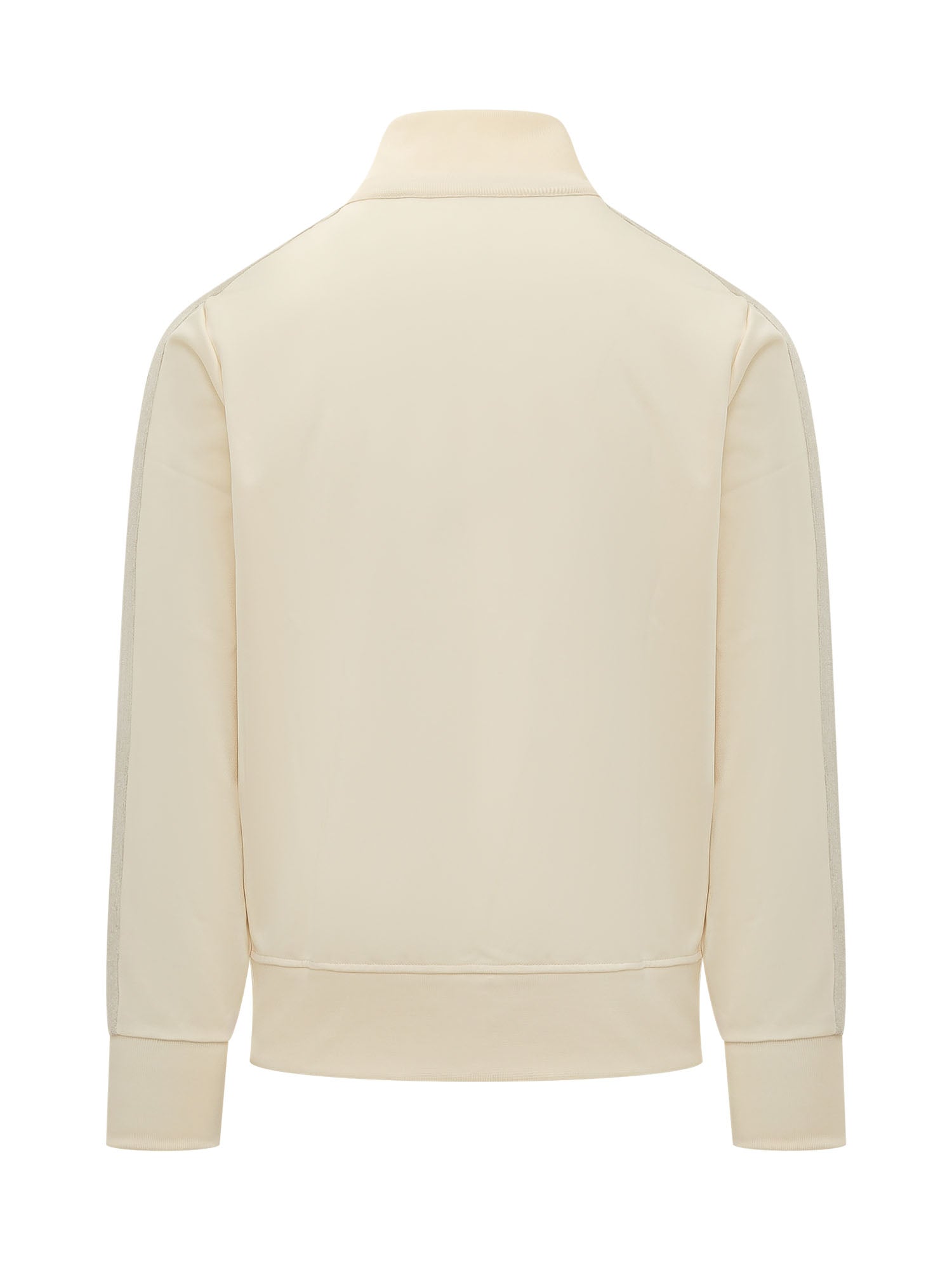 Felpa con collo alto e chiusura zip frontale, maniche lunghe con banda sulle spalle, tasche laterali con zip e logo sul petto, polsini e fondo a costine.
