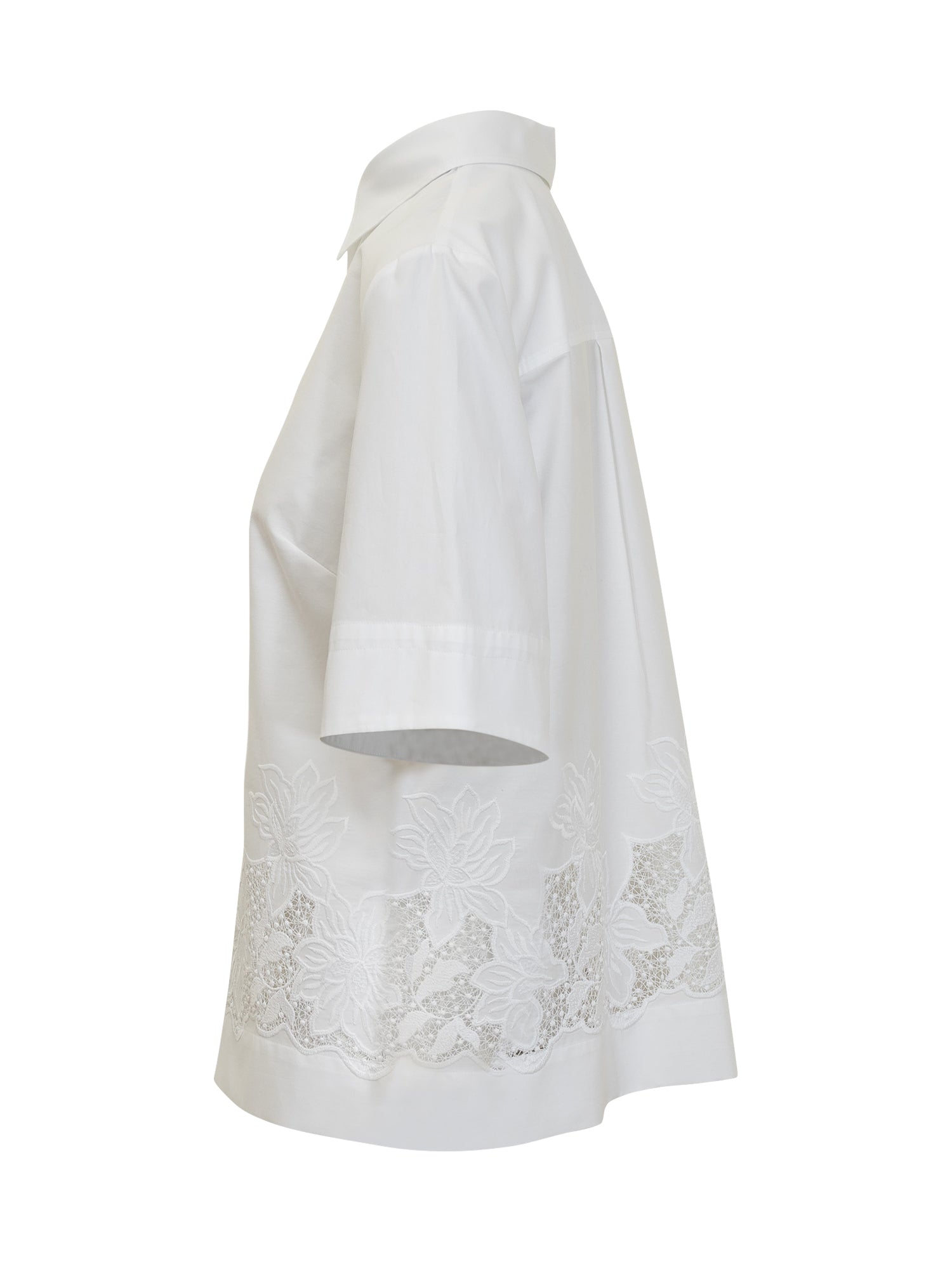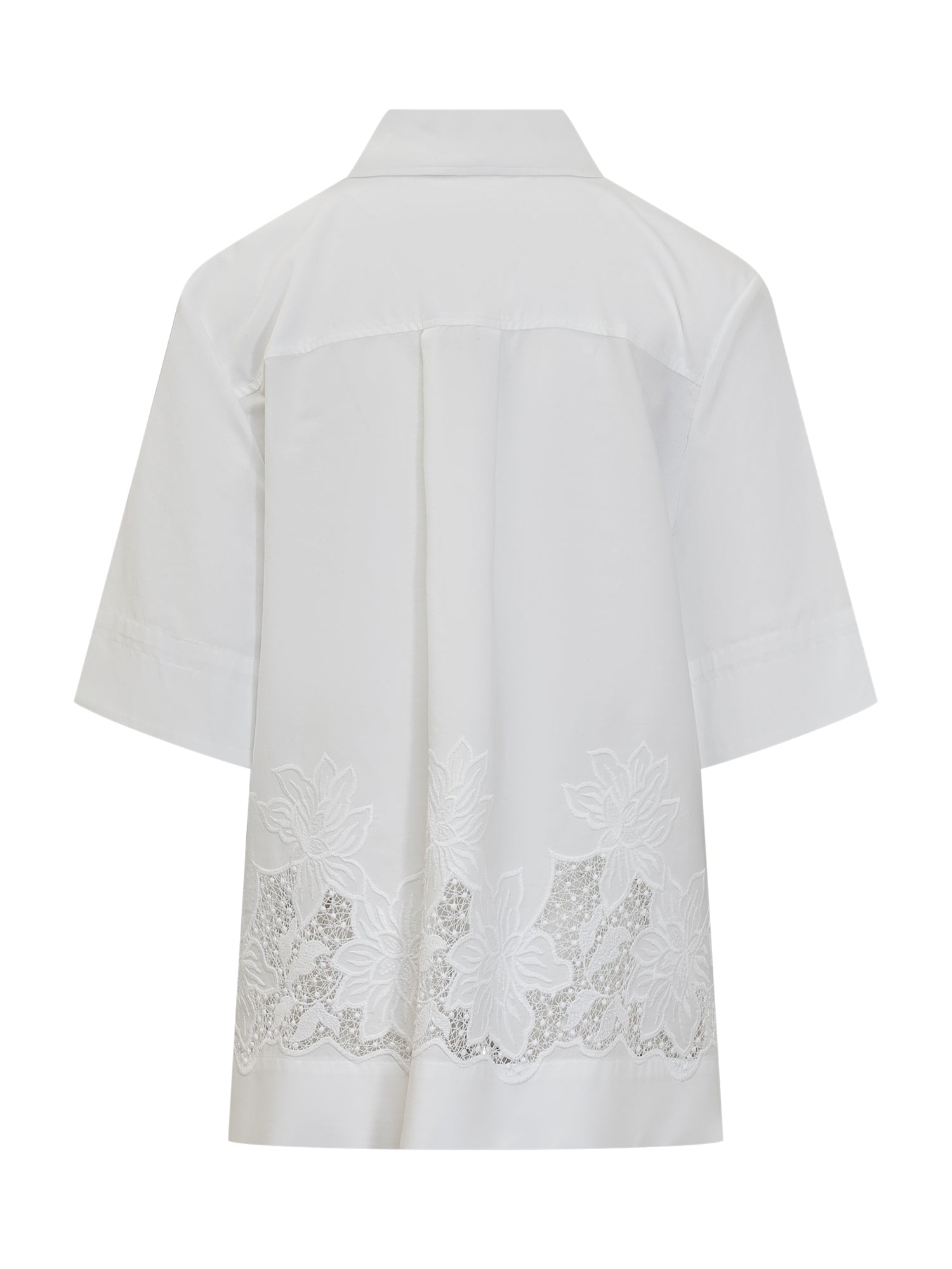 Colletto a punta. Maniche corte. Spalle scese. Chiusura con bottoni. Ricamo sul fondo.
