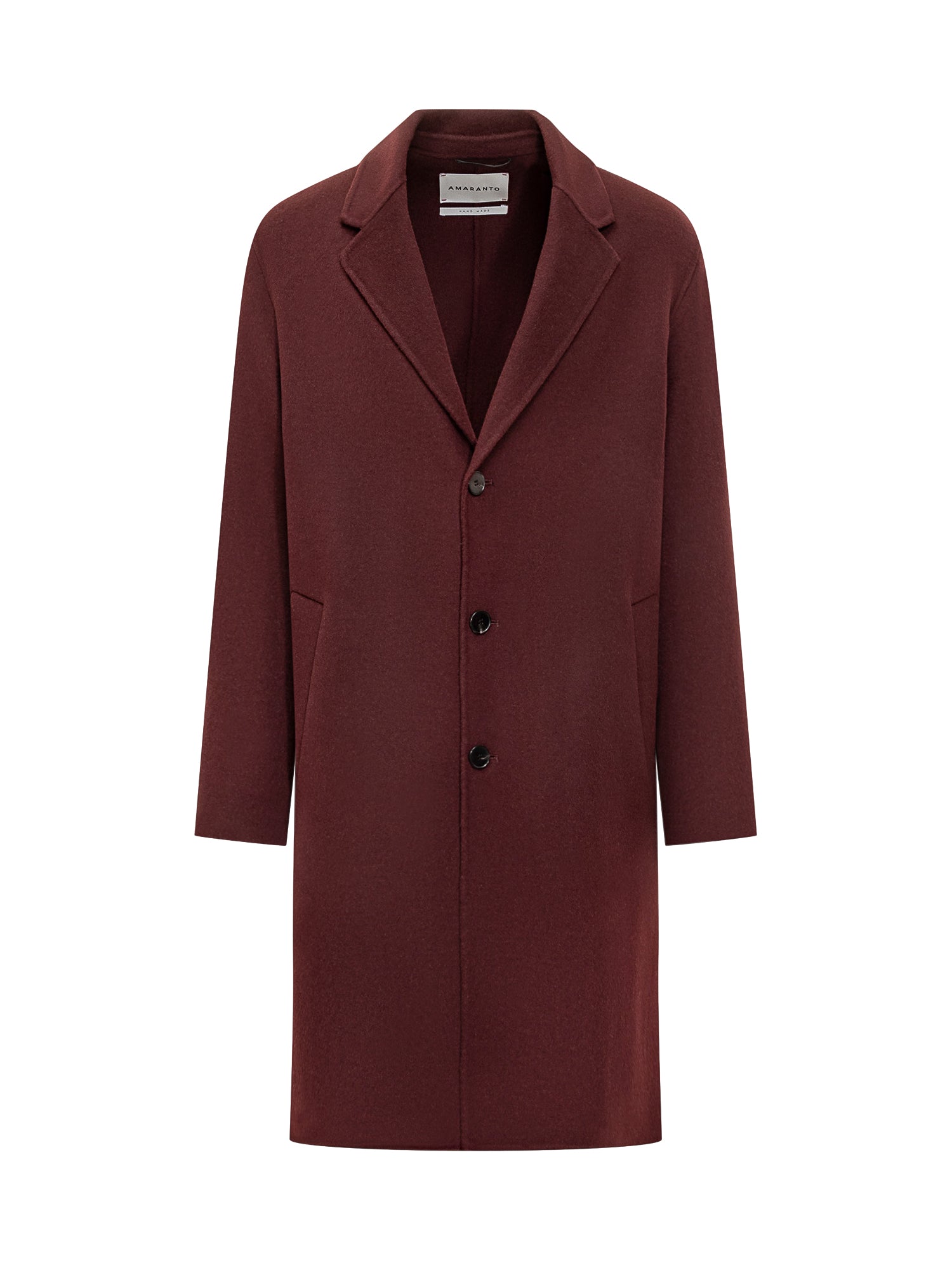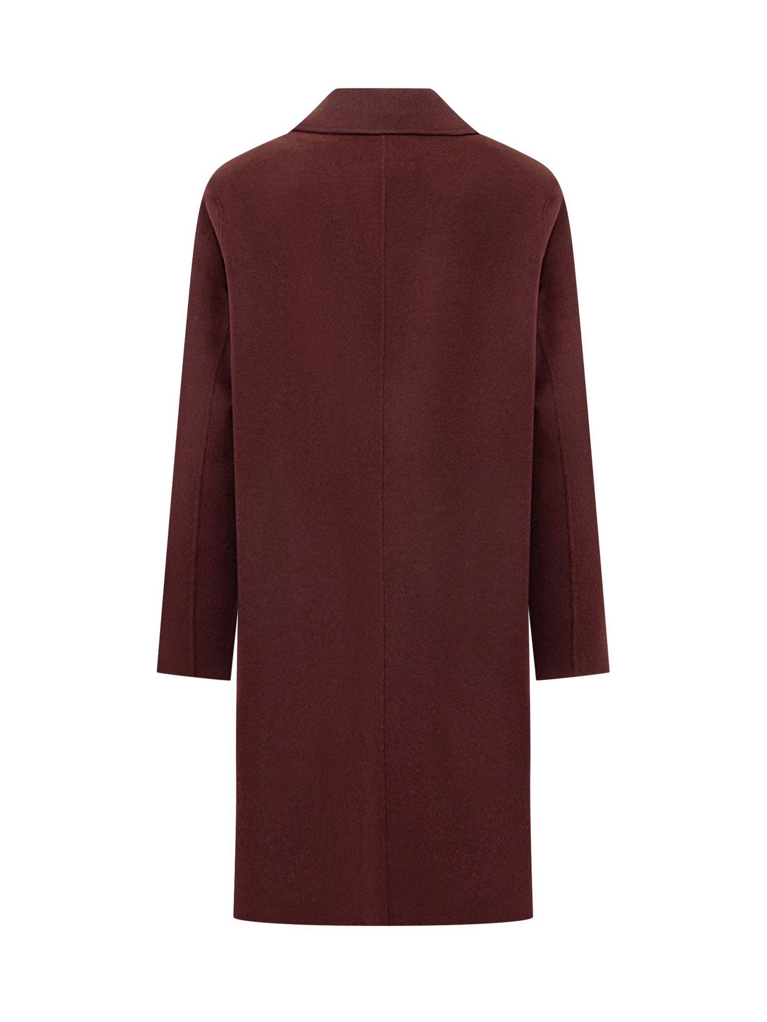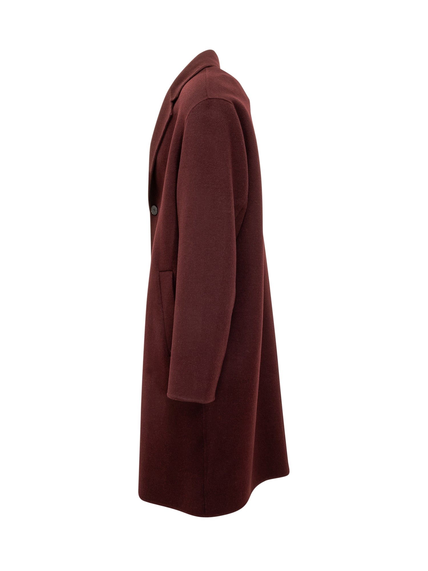 Cappotto Amaranto in lana bordeaux dal taglio essenziale con revers classici e chiusura a tre bottoni.