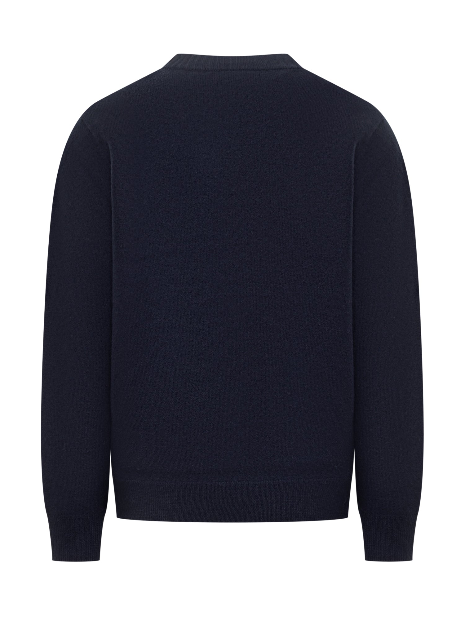Maglione A.P.C. in lana blu con girocollo e maxi logo rosso a rilievo sul petto.