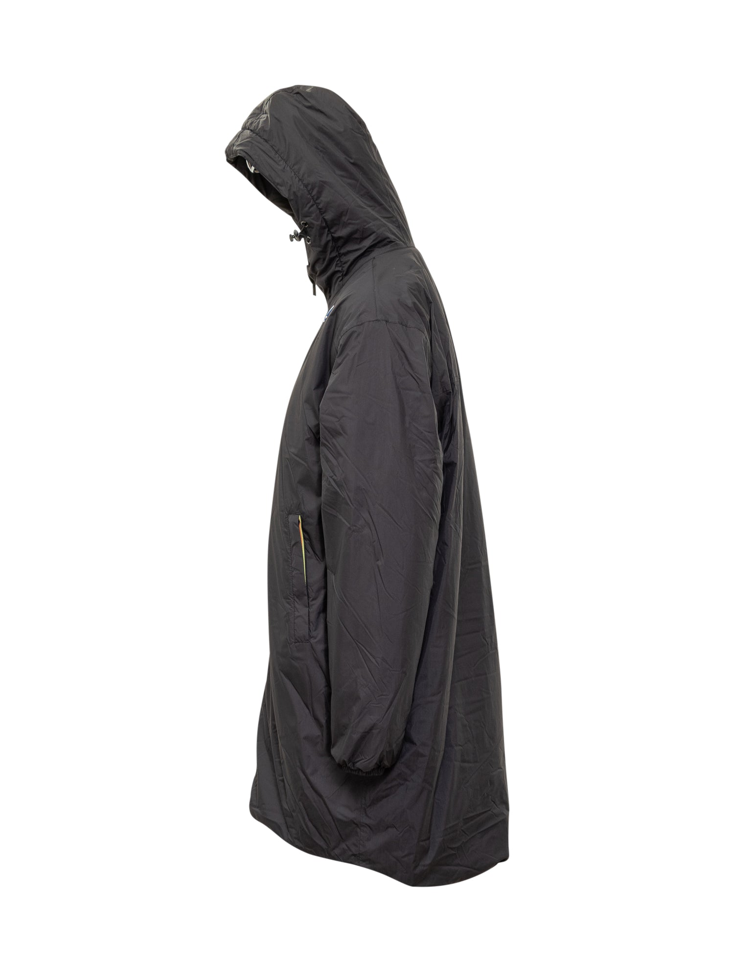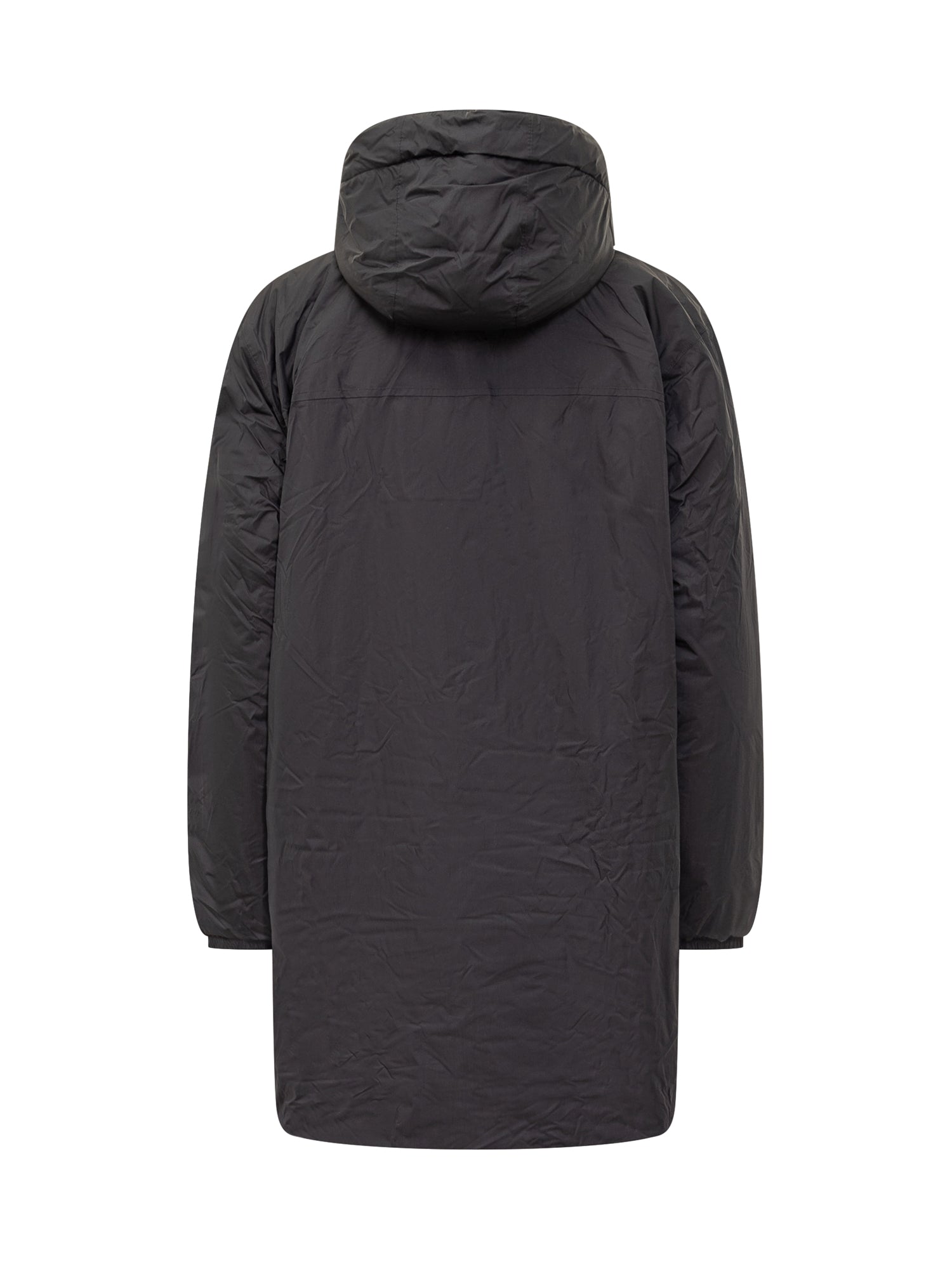 Parka K-Way lungo nero con cappuccio, chiusura con zip multicolor e interno in morbida pelliccia sintetica.