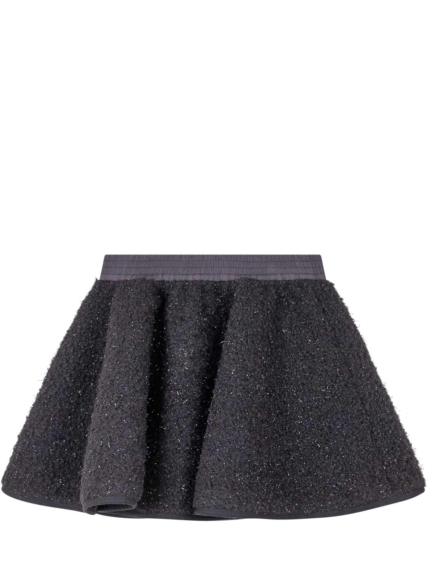 Gonna nera svasata Moncler per bambine, con finitura brillante. Vita elasticizzata e logo laterale.