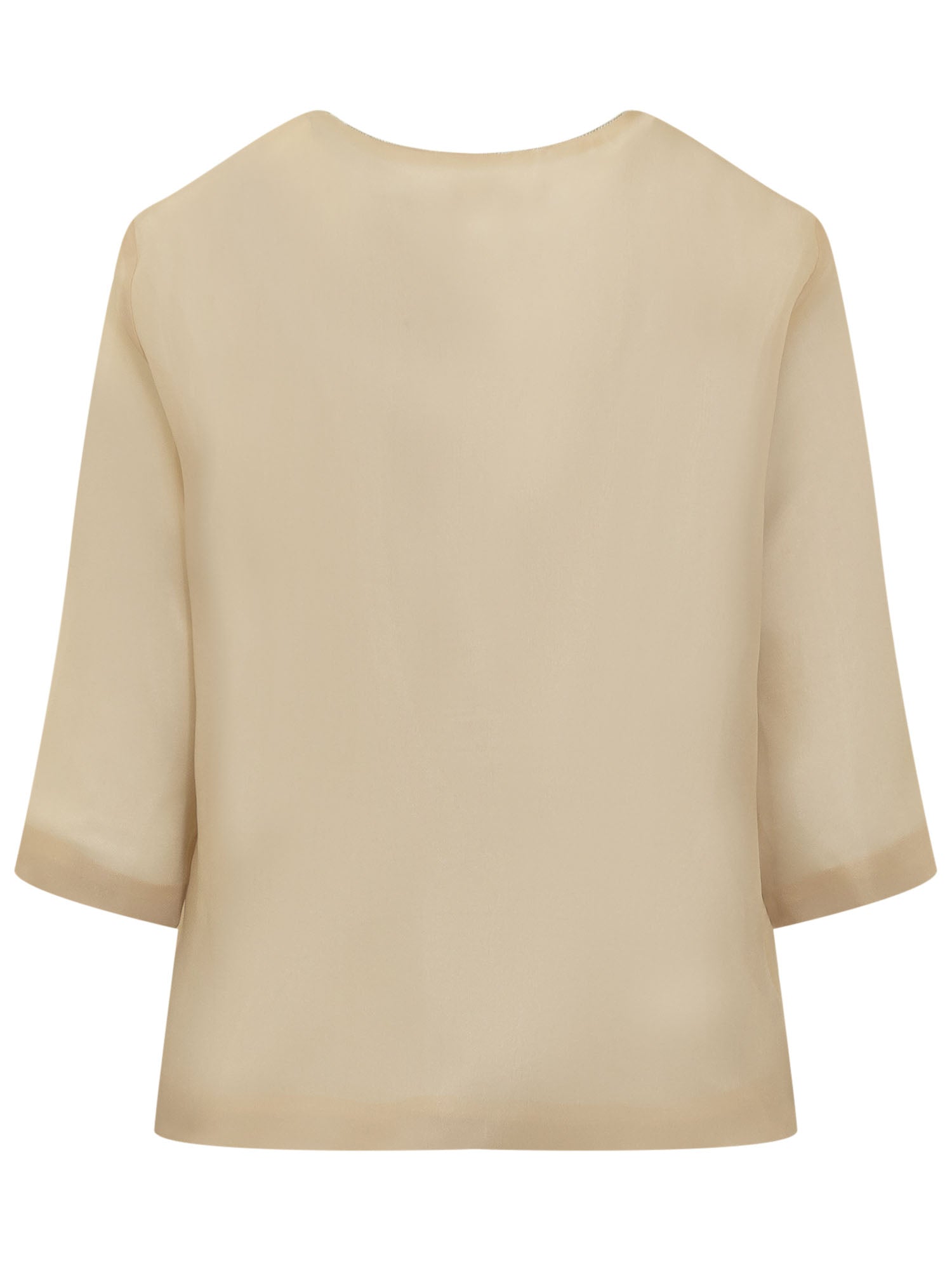 Blusa a maniche lunghe. Girocollo. Chiusura con bottone al collo. Apertura sul davanti. Dettaglio micro brillanti applicati sul collo. Realizzato in tessuto organza.