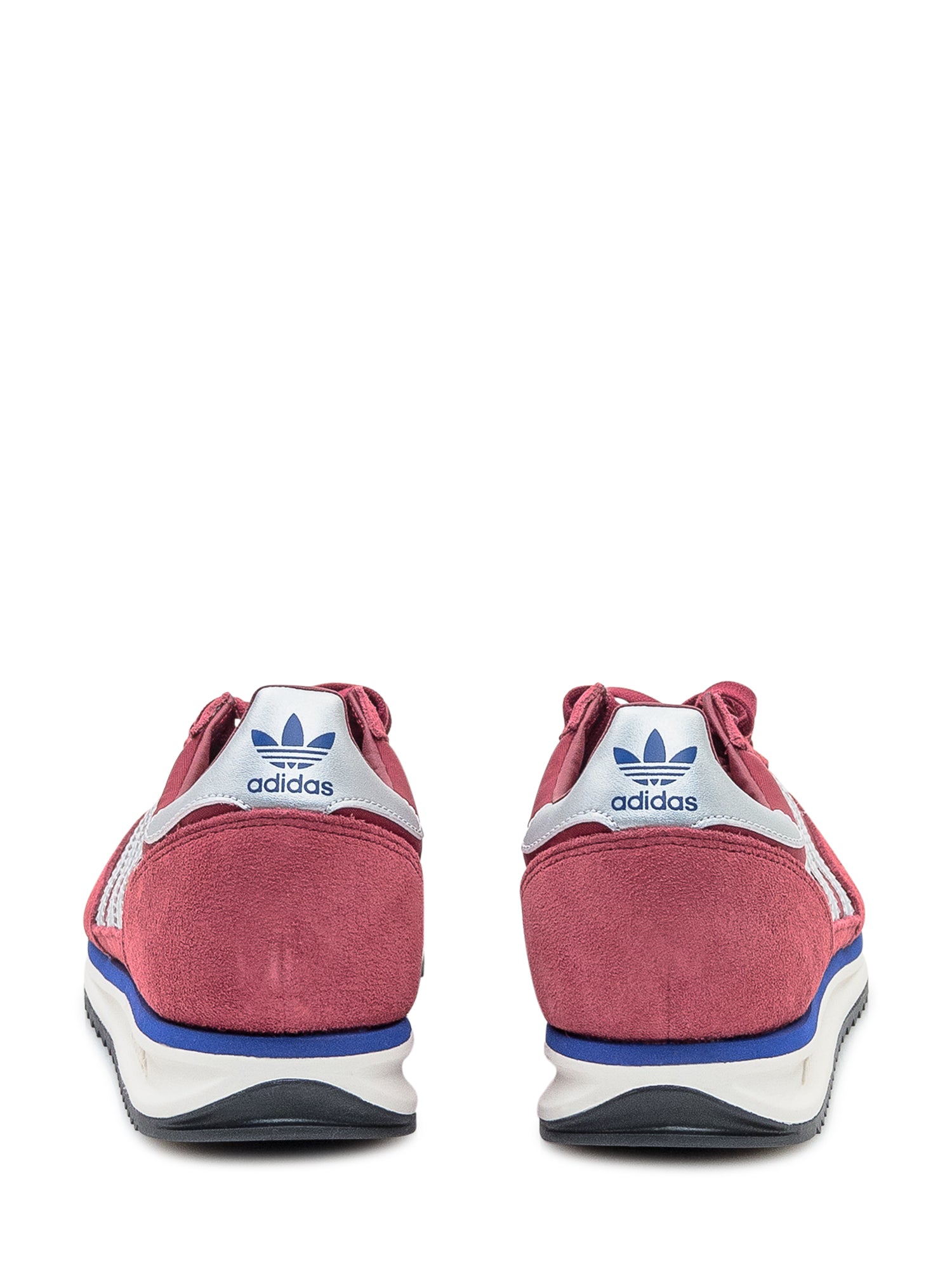 Sneaker Adidas SL72 RS in tessuto e suede bordeaux con iconiche tre strisce laterali argentate. Suola in gomma e dettagli blu per un look sportivo e retrò.