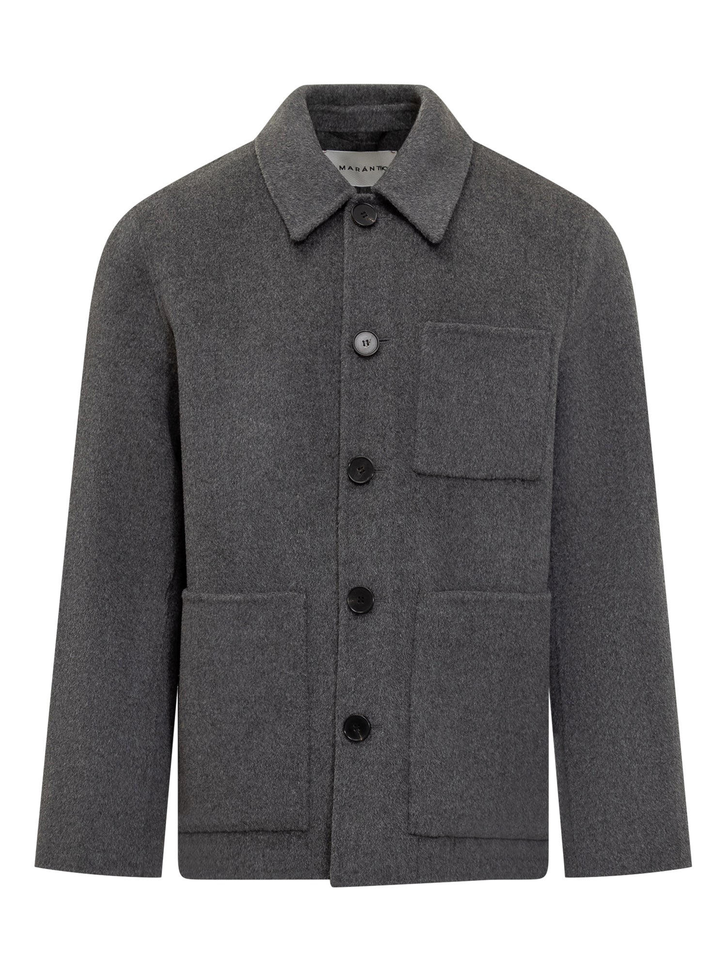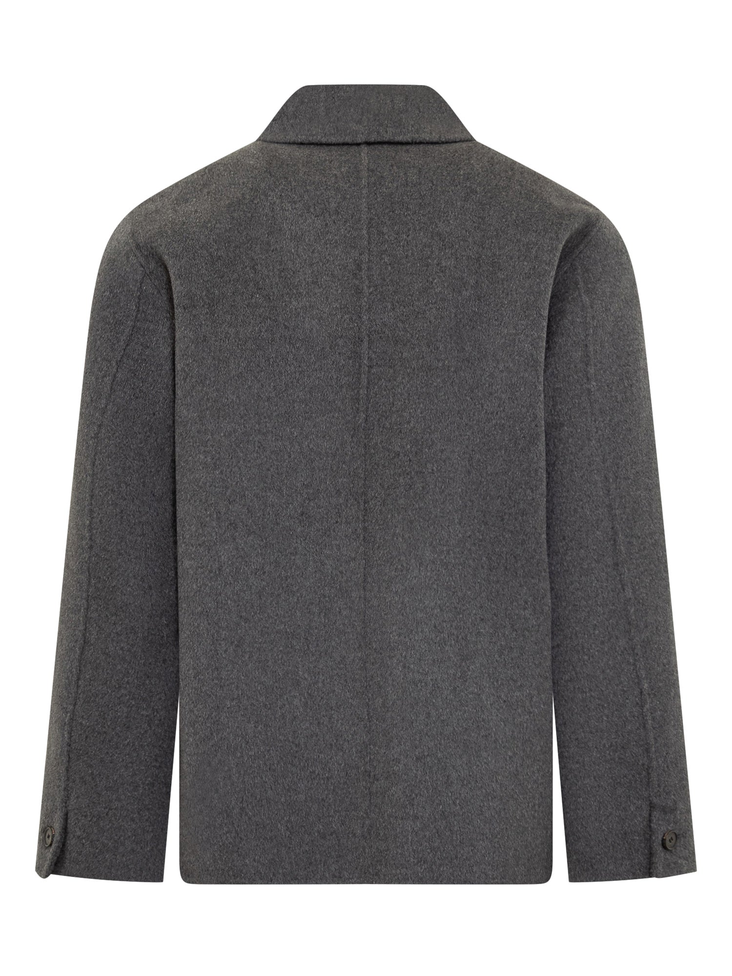 Giacca Amaranto in lana grigia con chiusura a bottoni, colletto classico e tasche applicate.