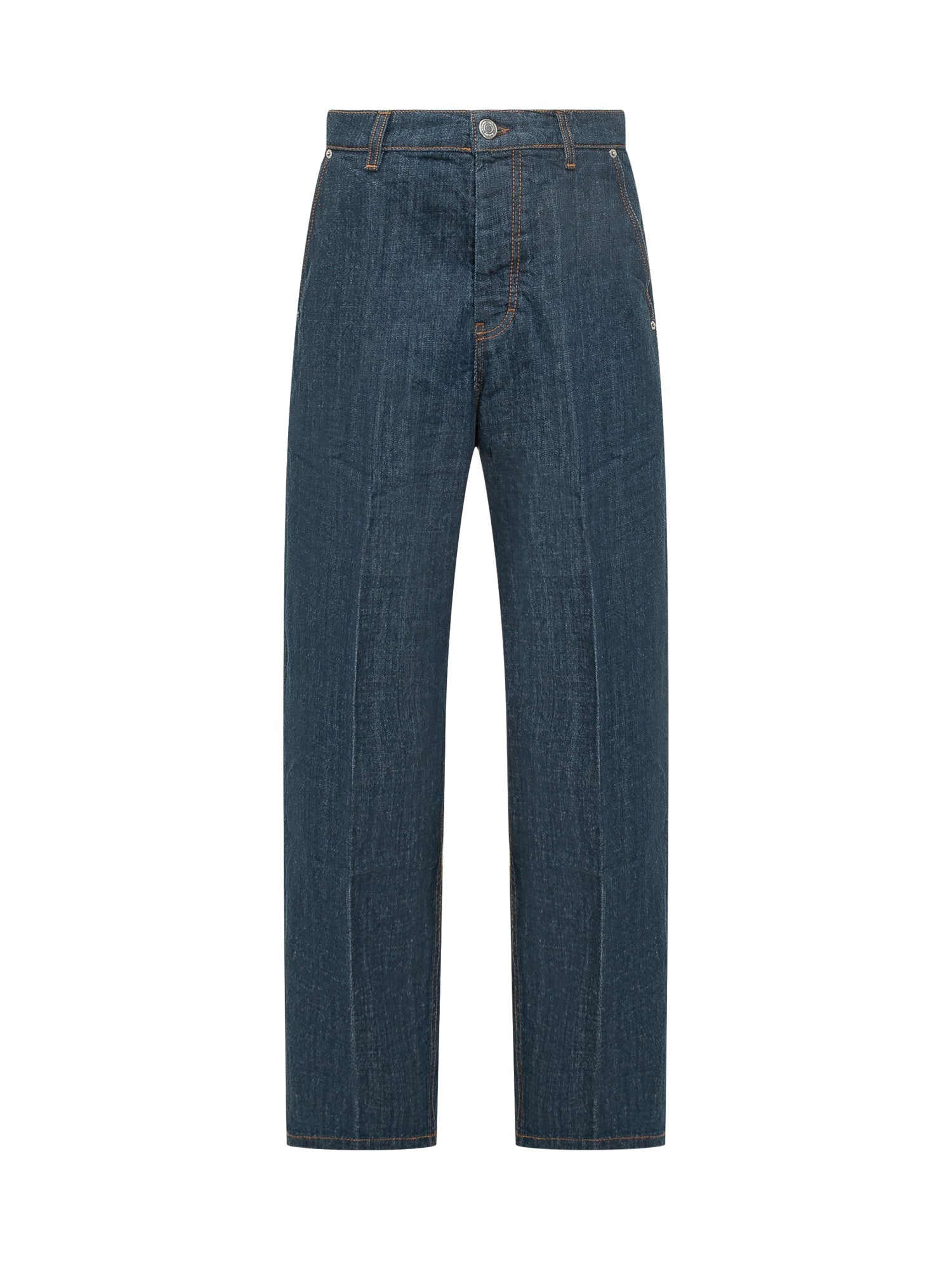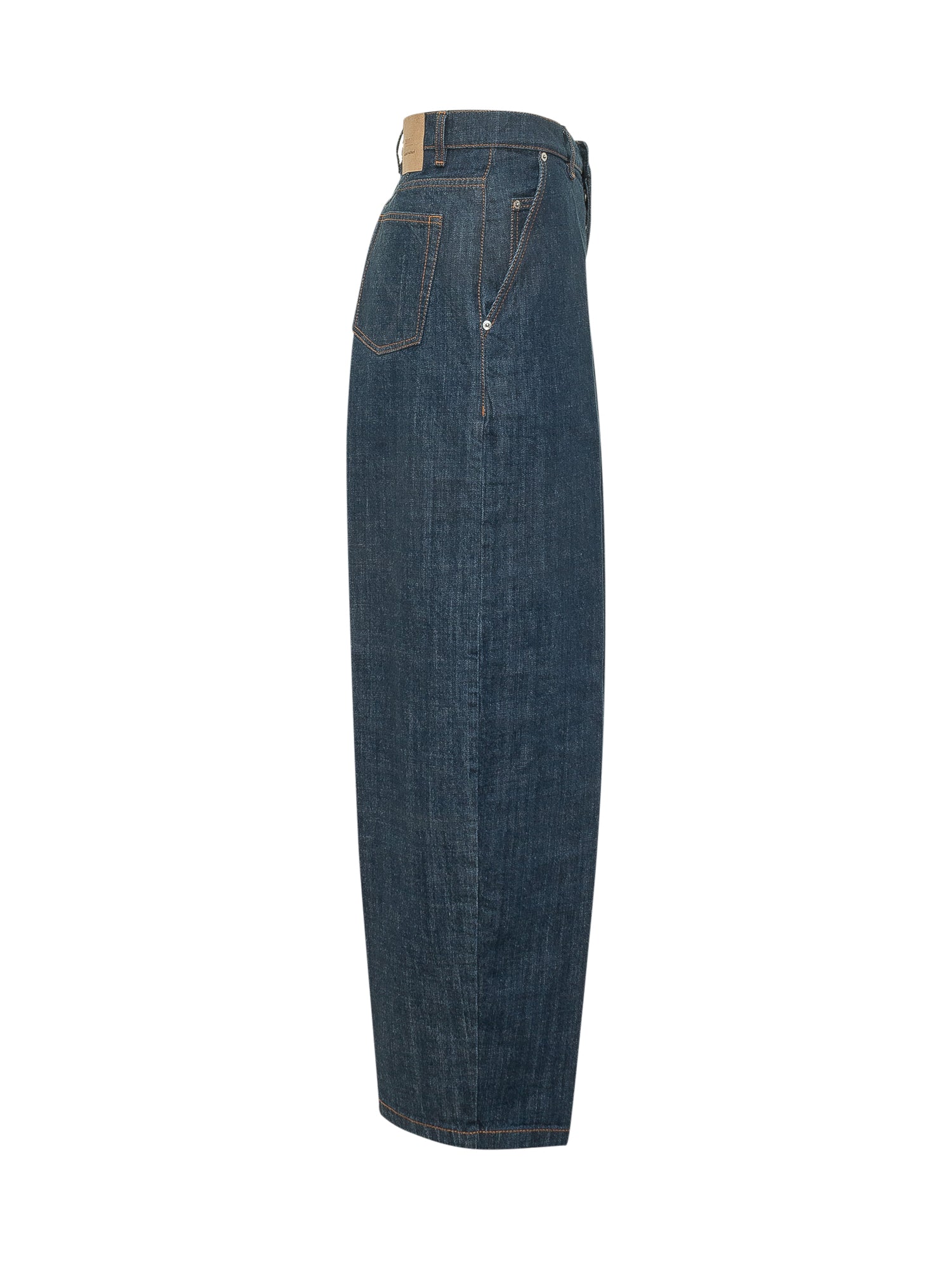 Jeans a vita alta con cinque tasche e chiusura con bottone. Gamba ampia con linea arrotondata e fondo regolare per uno stile deciso.
