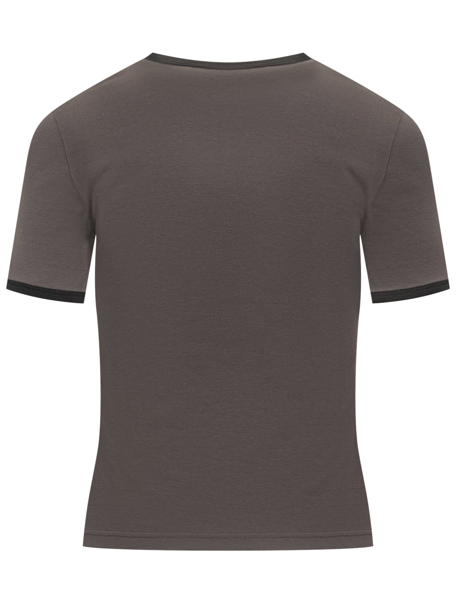 T-shirt Courrèges in cotone elasticizzato grigio con bordi neri a contrasto e logo ricamato sul petto.