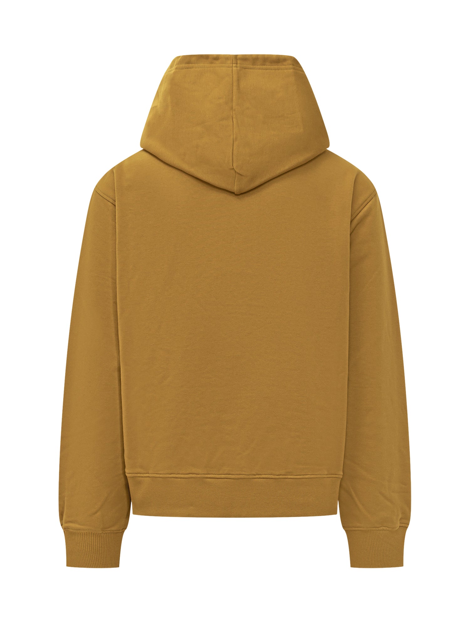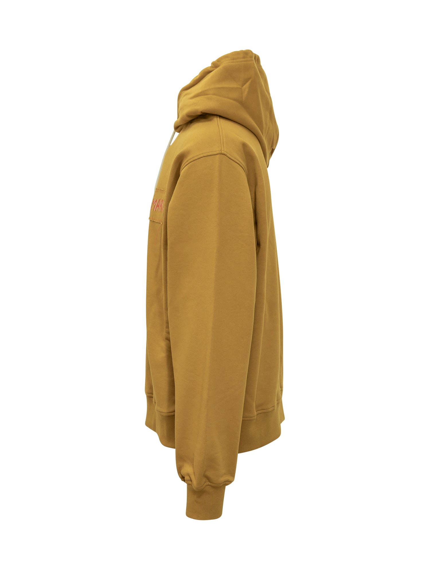 Felpa con cappuccio in cotone giallo senape firmata Marni, con coulisse chiara e patch logo ricamato sul petto.
