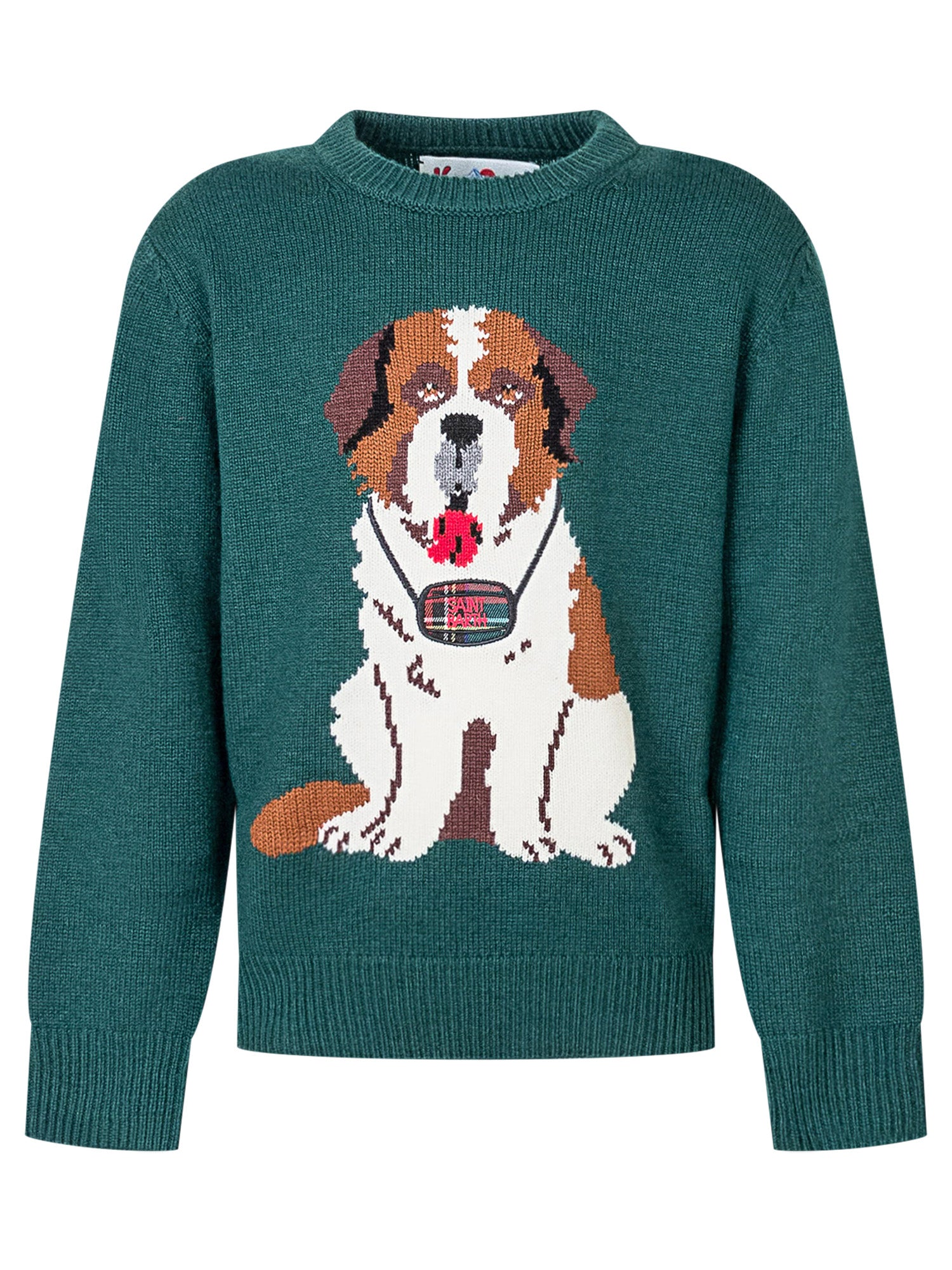 Maglione MC2 Saint Barth Kids in cotone verde con divertente motivo di cane San Bernardo frontale.
