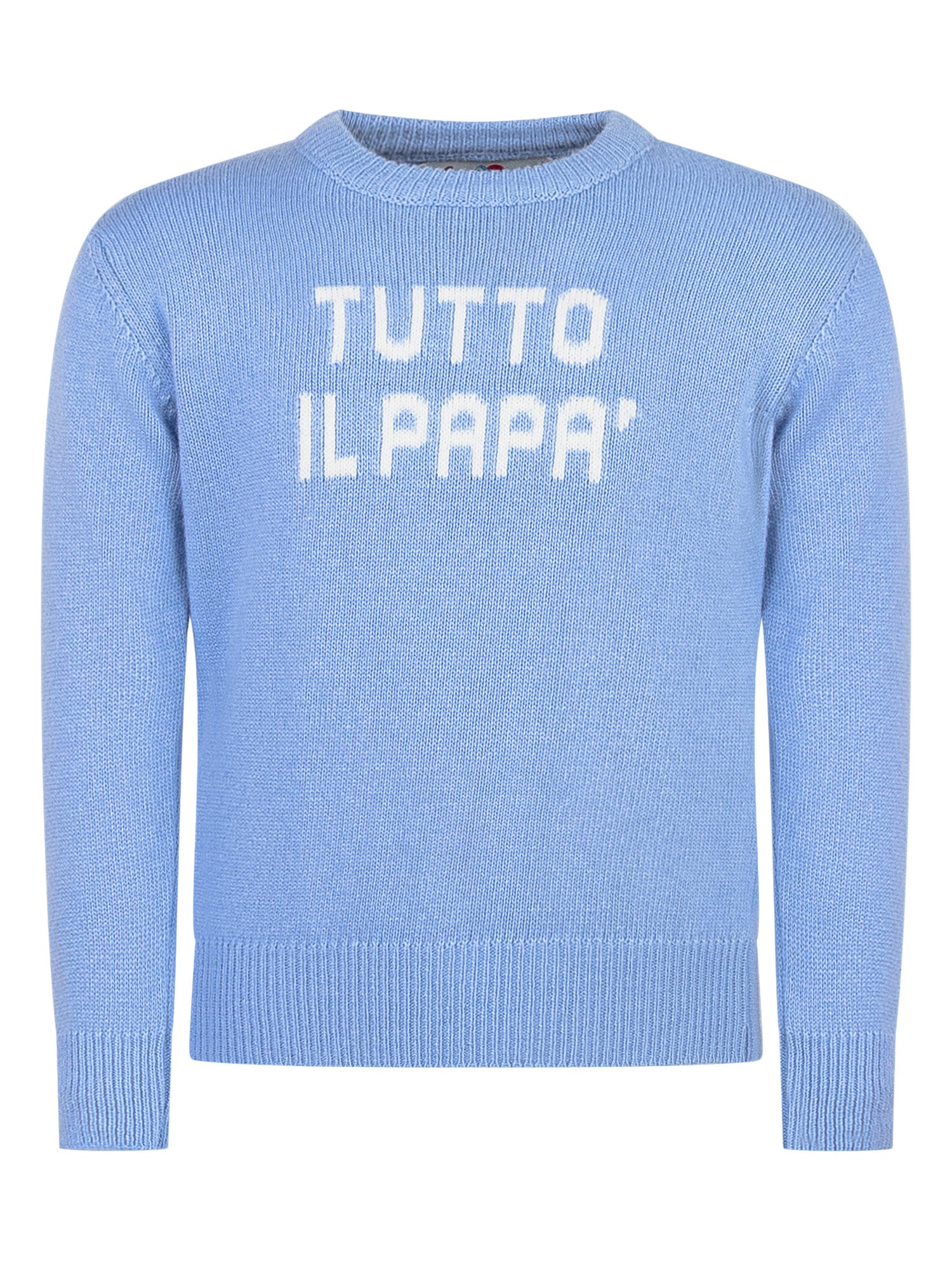 Maglione azzurro MC2 Saint Barth con scritta divertente a contrasto.