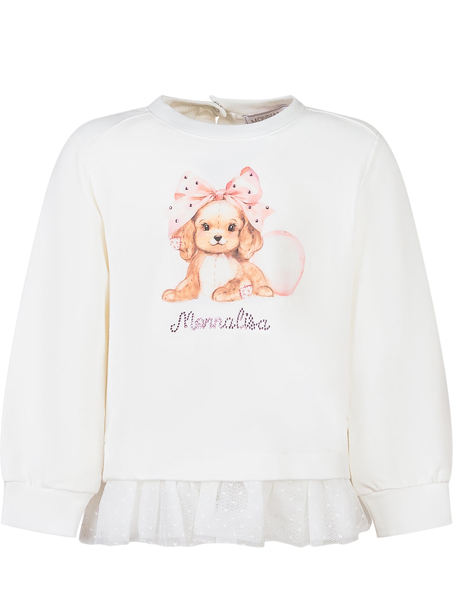 Felpa Monnalisa in cotone bianco con stampa cucciolo e fiocco rosa, arricchita da logo strass e balza in tulle al fondo.