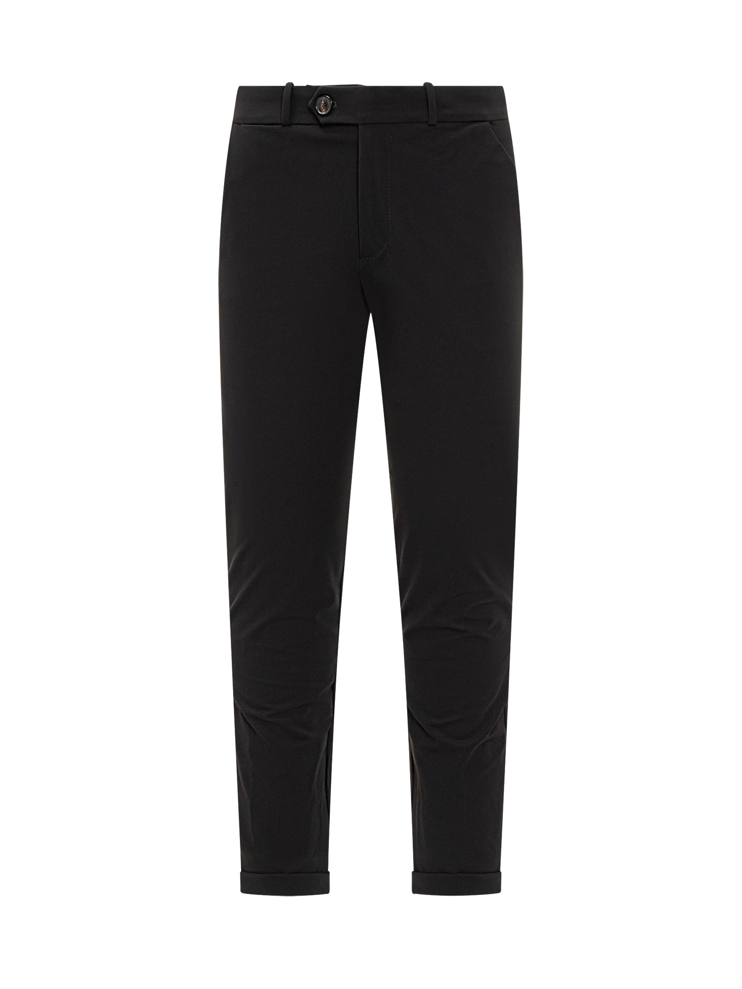 Pantaloni RRD in tessuto tecnico nero stretch con chiusura a bottone, passanti e risvolto.