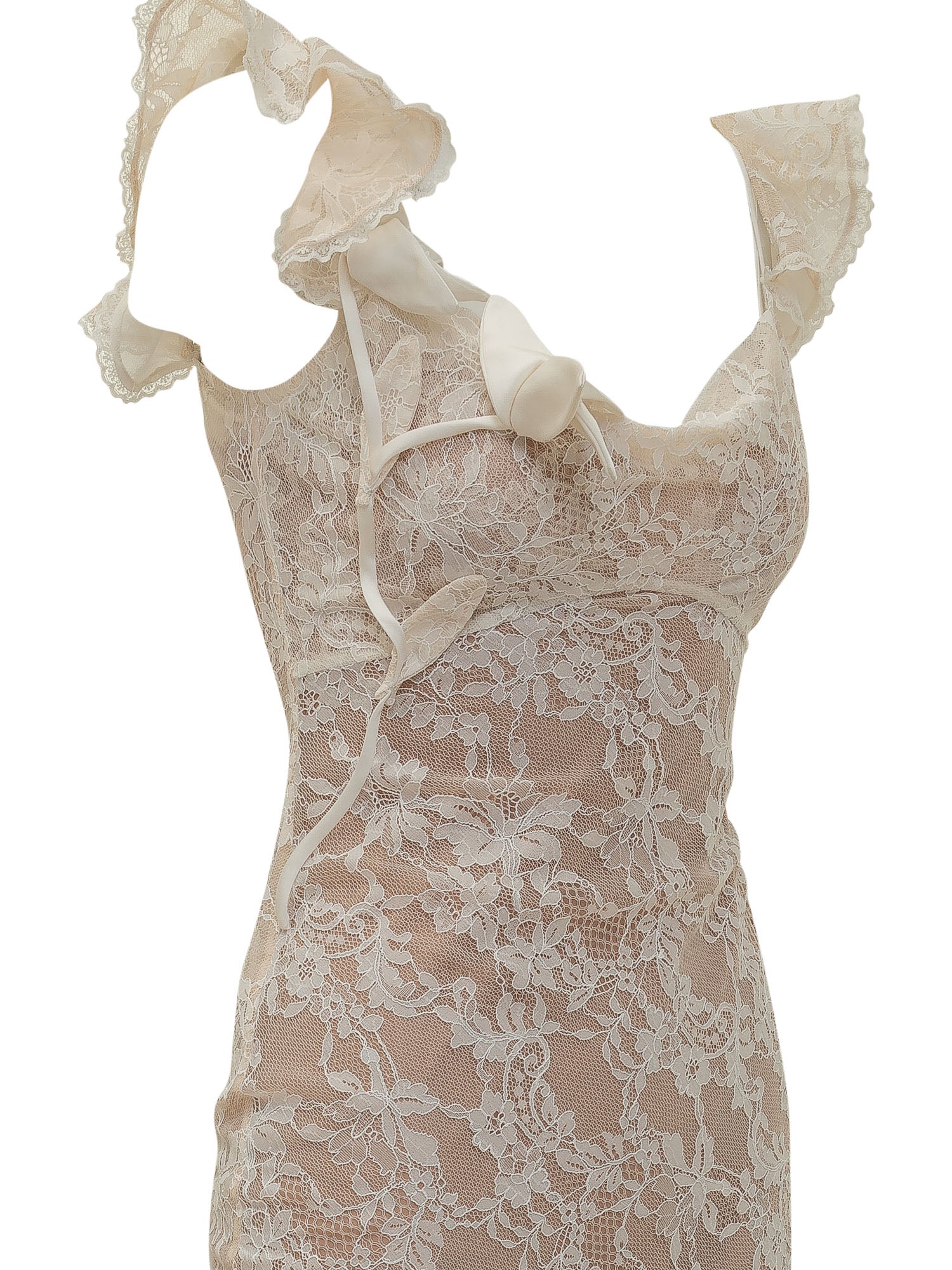 Abito lungo realizzato in delicato pizzo floreale con silhouette aderente che valorizza la figura. Il modello presenta spalline con volant romantici e una linea elegante che si apre leggermente sul fondo. Perfetto per cerimonie ed eventi speciali, unisce femminilità e raffinatezza senza tempo.