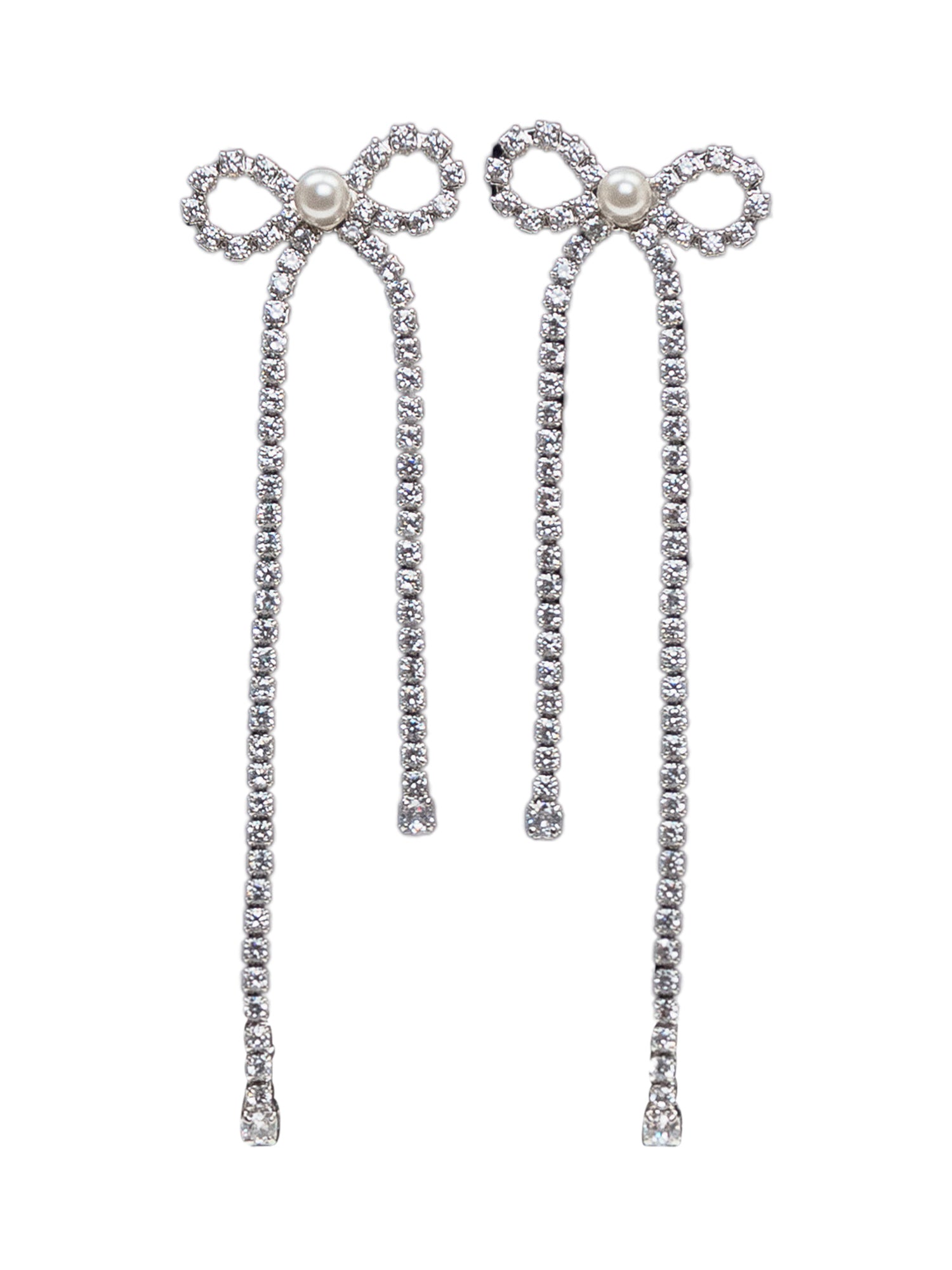 Orecchini pendenti con cristalli luminosi e dettaglio fiocco, impreziositi da una perlina centrale.
