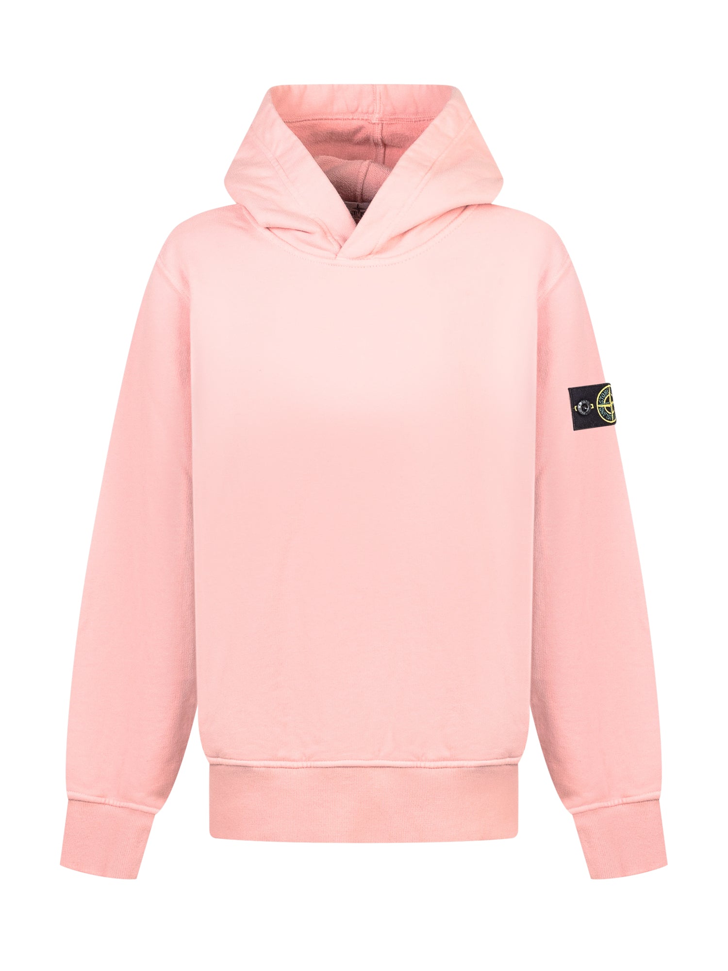 Felpa Stone Island Kids rosa con cappuccio e patch logo sulla manica.
