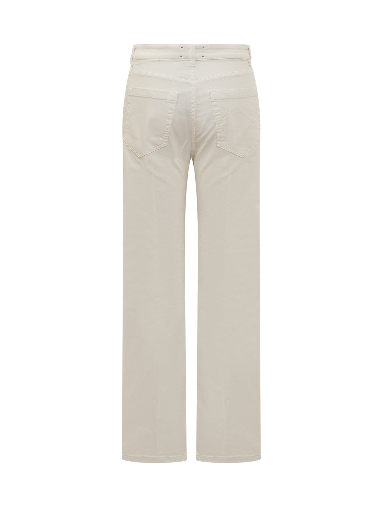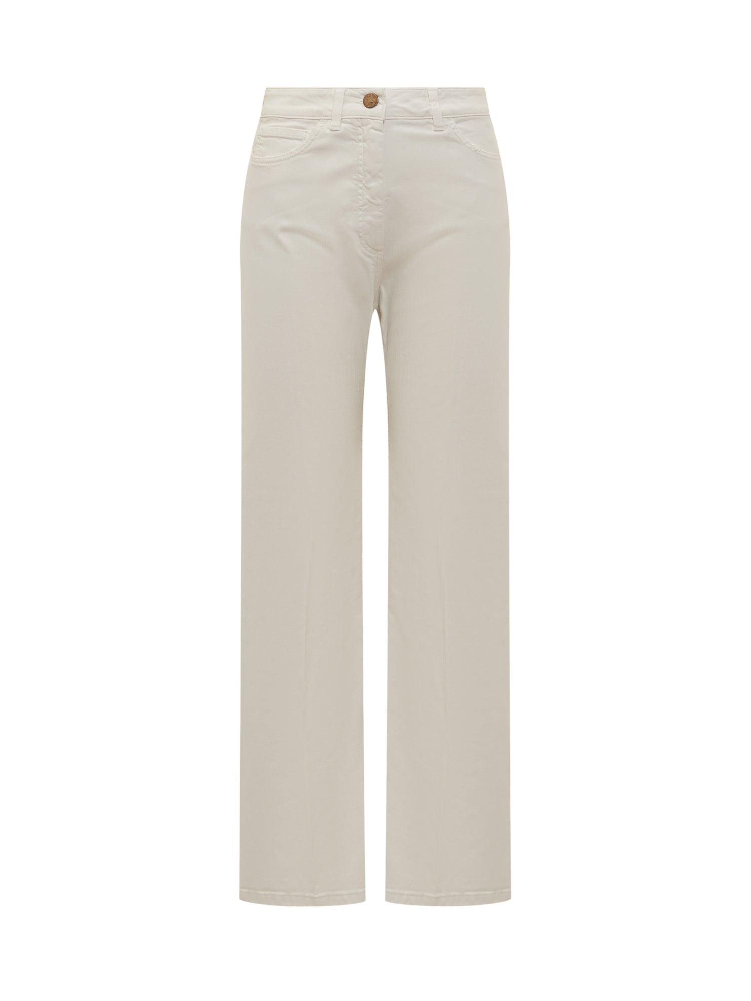 Jeans lunghi wide leg. Chiusura con bottone e zip. Cinque tasche. Passanti per cintura.
