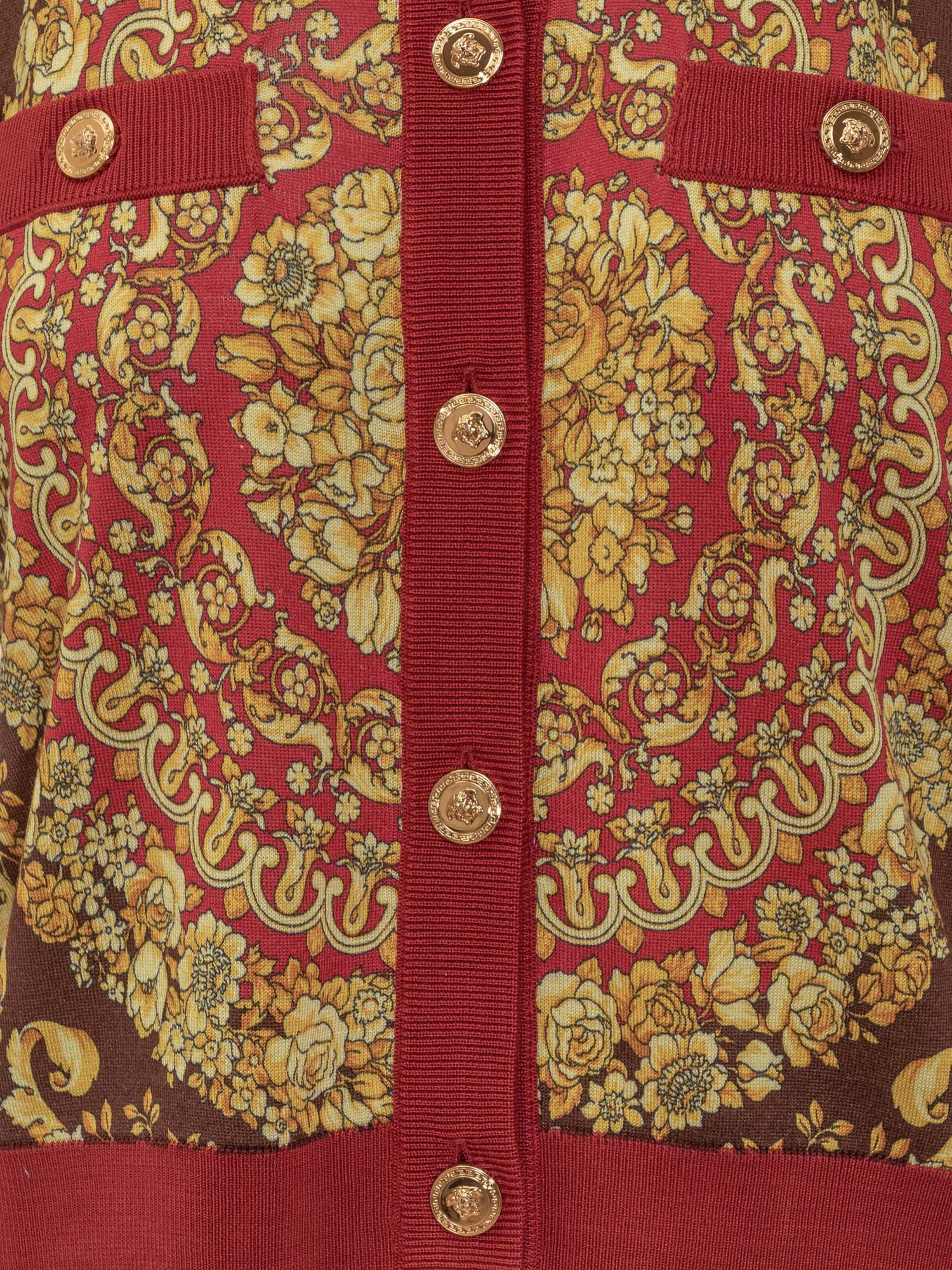 Cardigan Versace in maglia con stampa barocca multicolor. Bottoni dorati con logo, dettagli rossi a contrasto.